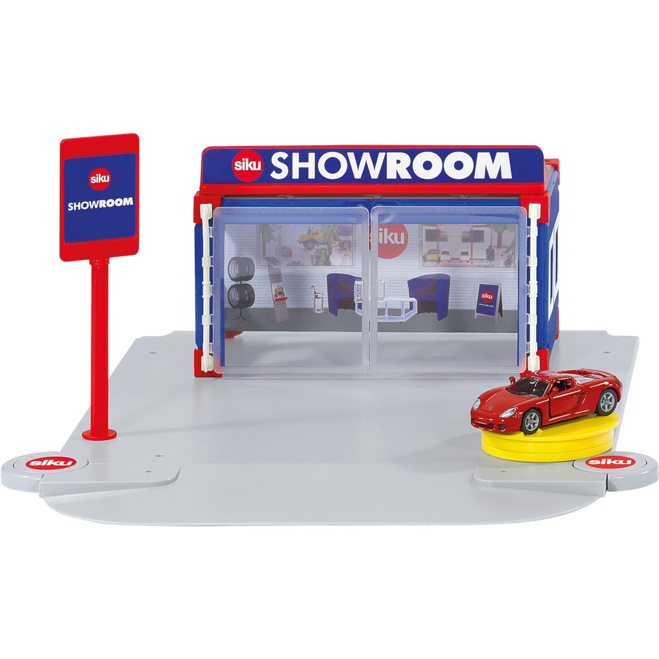 Az autóház nagy méretű, magasfényű ablakokkal ellátott ajtóival kényelmes be- és kihajtást tesz lehetővé. A mellékelt Porsche Carrera GT különleges látványosságként helyezhető el a forgatható prezentációs talapzaton. A standard alaplap révén az autóház könnyedén kombinálható a SIKU WORLD sorozat egyéb elemeivel, ezzel biztosítva a játékvilág rugalmasságát és bővíthetőségét.