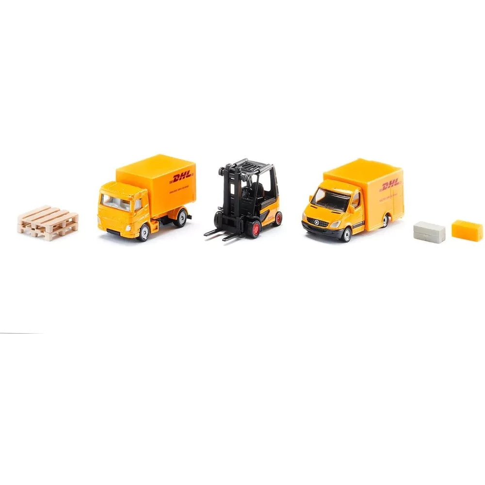 • Három jármű egy csomagban: két szállítójármű és egy targonca, együtt használható logisztikai játékhelyzetekhez