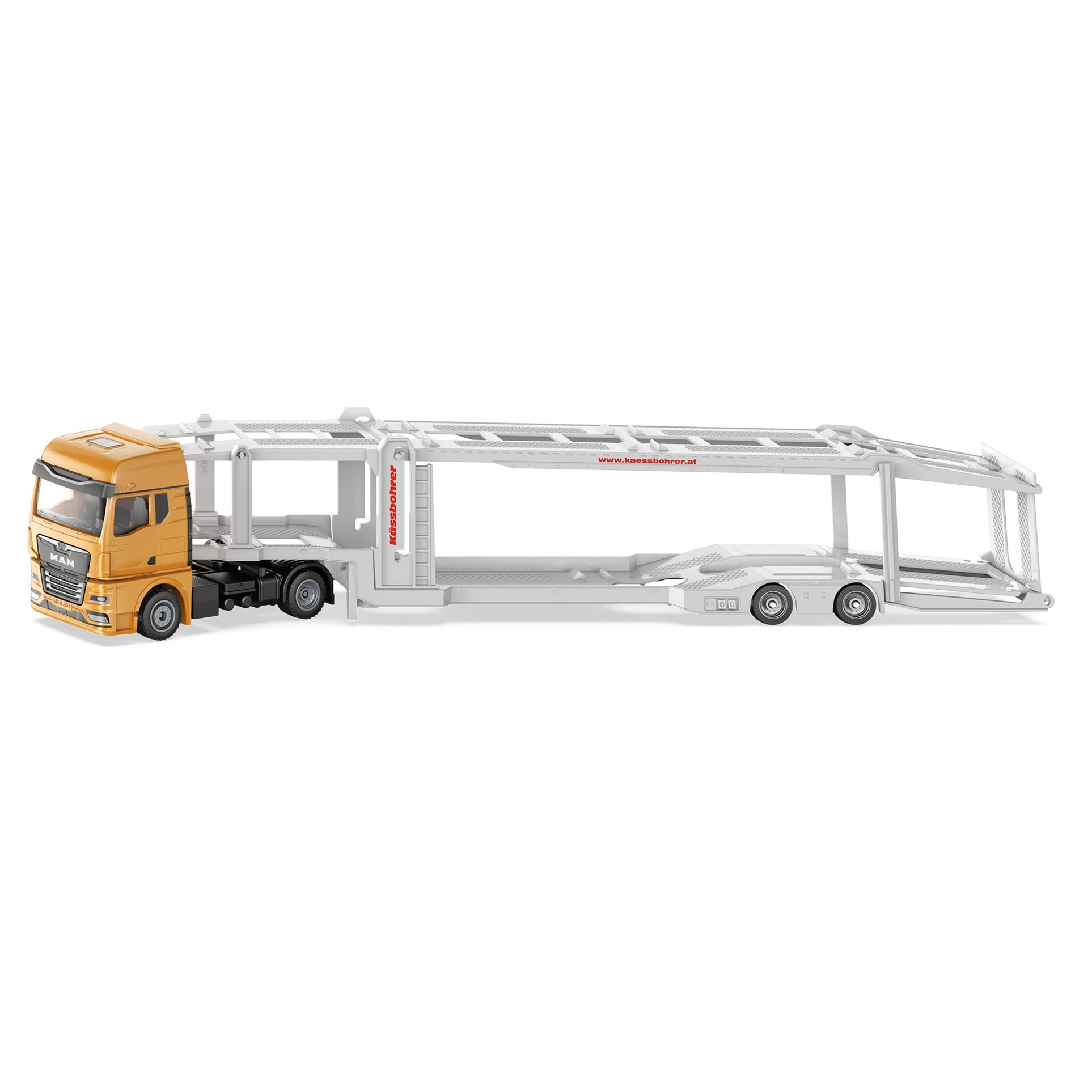 Ez az autószállító gyorsan sztár lesz minden modellautó kollekcióban! Az egyik autó a másik mellett sorakozik kétszintes rakodóterén, ahol a csomagtérajtó nyitható a kirakodáshoz. A részletes MAN traktor és ennek a SIKU-modellnek az 1:50 méretarányú pótkocsija masszív présöntött cinkből készül, műanyag kiegészítő alkatrészekkel.