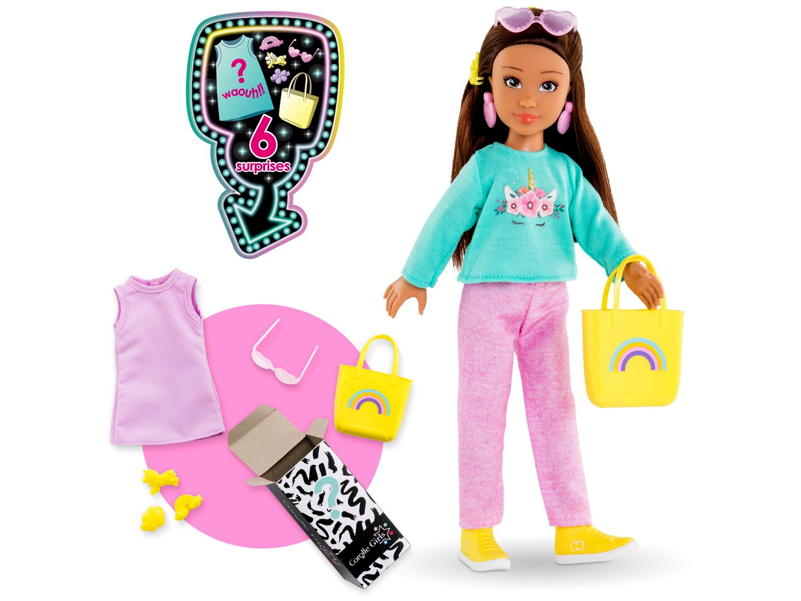 Ruha, hajcsatok, táska és napszemüveg is biztosított. Mint minden Corolle baba, Luna kellemes vanília illatú. Körülbelül 28 centiméter magas, festett szemekkel rendelkezik, és önállóan állhat és ülhet.