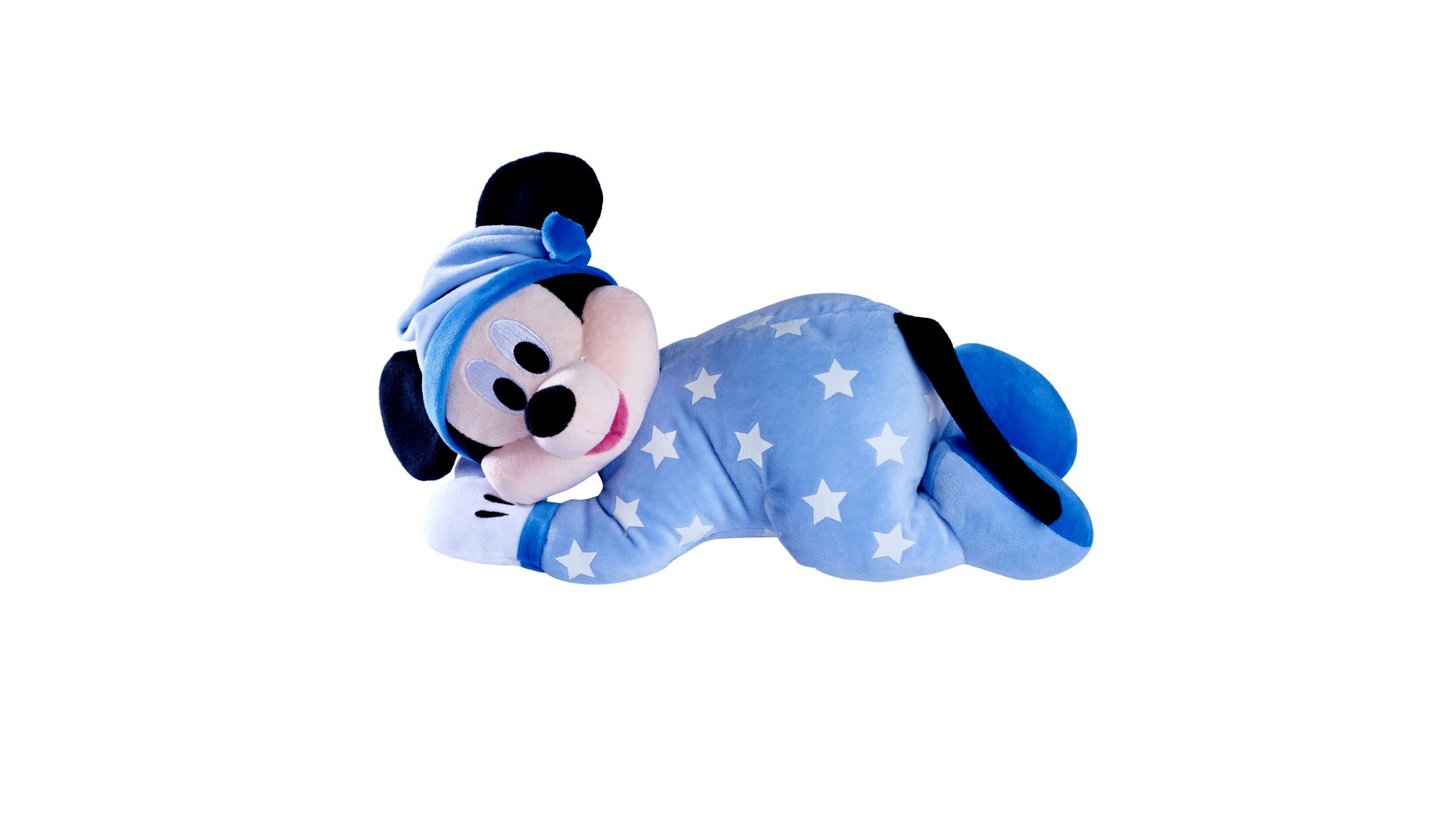 Az aranyos Mickey egér plüssfigura kék pizsamát visel csillagokkal és alvósapkával, és a fejét a kezére hajtva alszik. A sok csillag a fürdőruhán képes tárolni a fényt, ezért sötétedés után még egy ideig világít. Mickey szuper puha és bolyhos plüss anyagból készült. Ezáltal a plüssfigura tökéletes az összebújáshoz és az öleléshez, és elkíséri a gyerekeket, amikor elalszanak. A 30 cm magas Goodnight Mickey a gyermekek ölelkezős barátja, és ideális ajándék az újszülöttek első játékaként.