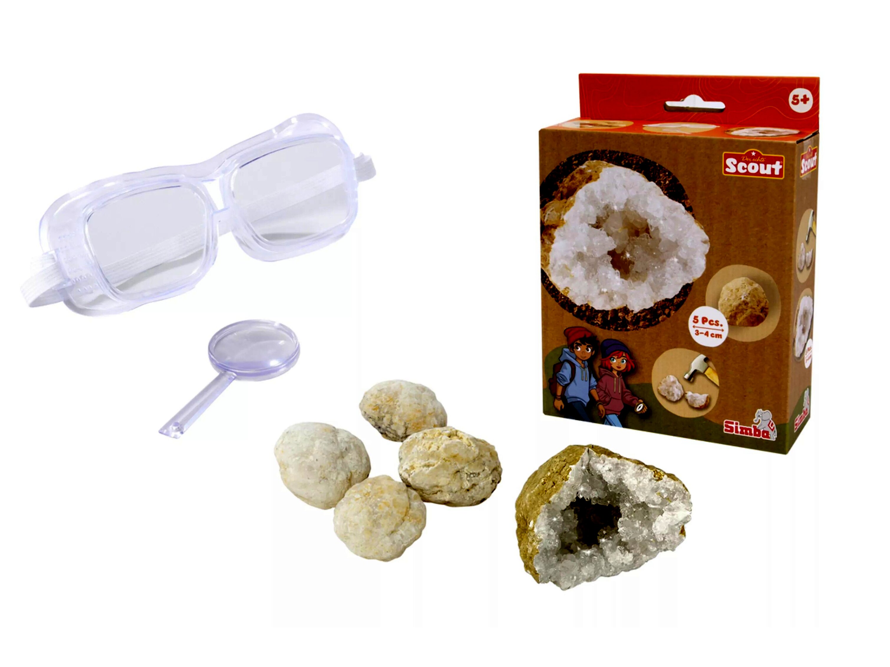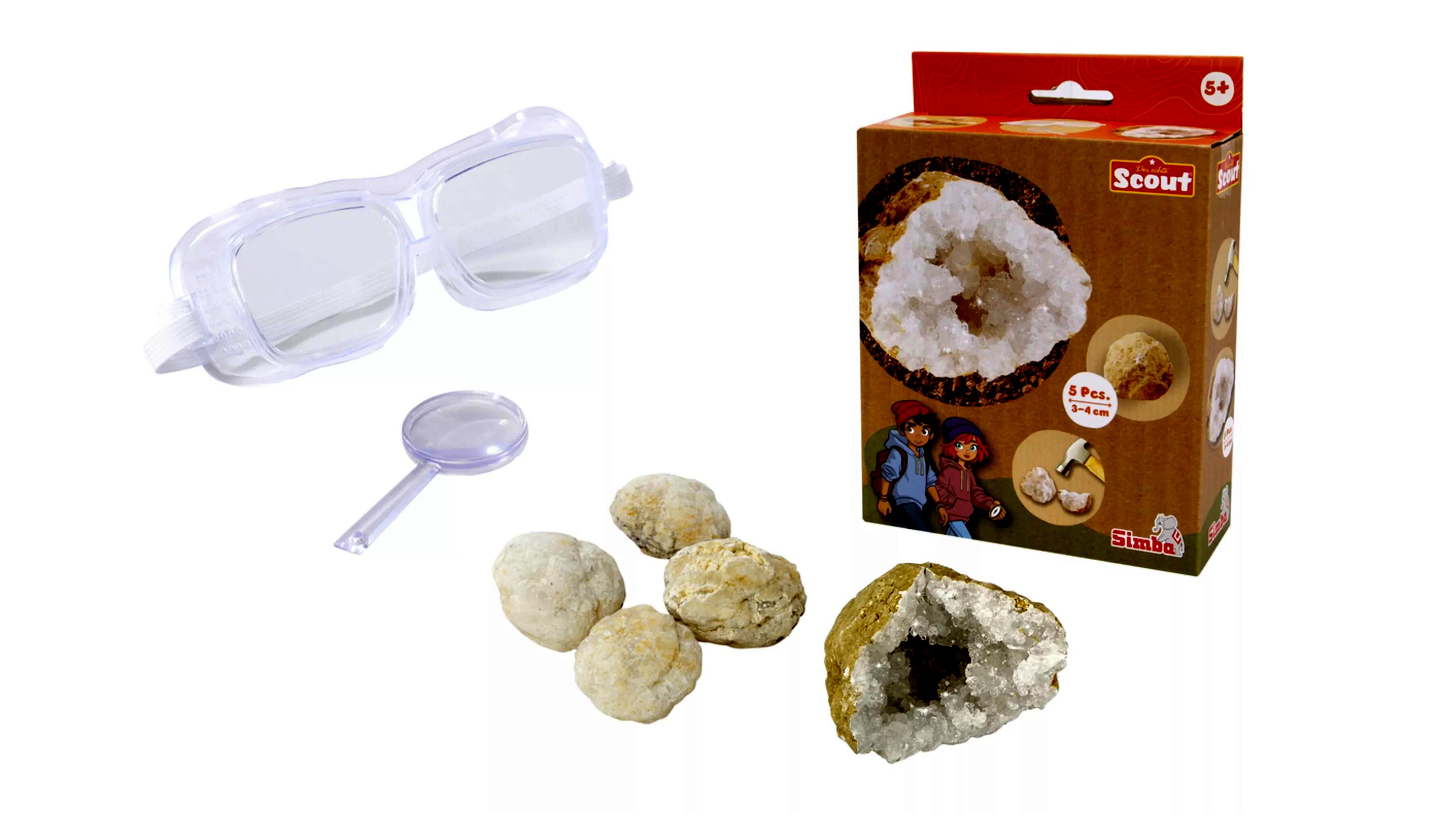 A dobozban 5 darab valódi, természetes geoda található. Ezek kívülről egyszerű, szürkés köveknek tűnnek, ám belül csillogó kristályüregek rejlenek. A kő külső rétege keményebb, ezt kalapáccsal lehet kettétörni (felnőtt segítségével), ekkor tárul fel a belső, fényes kristályfelület. Mivel minden geoda egyedi, a gyerekek mindig más formájú, mintázatú és szerkezetű kristályokat fedezhetnek fel.