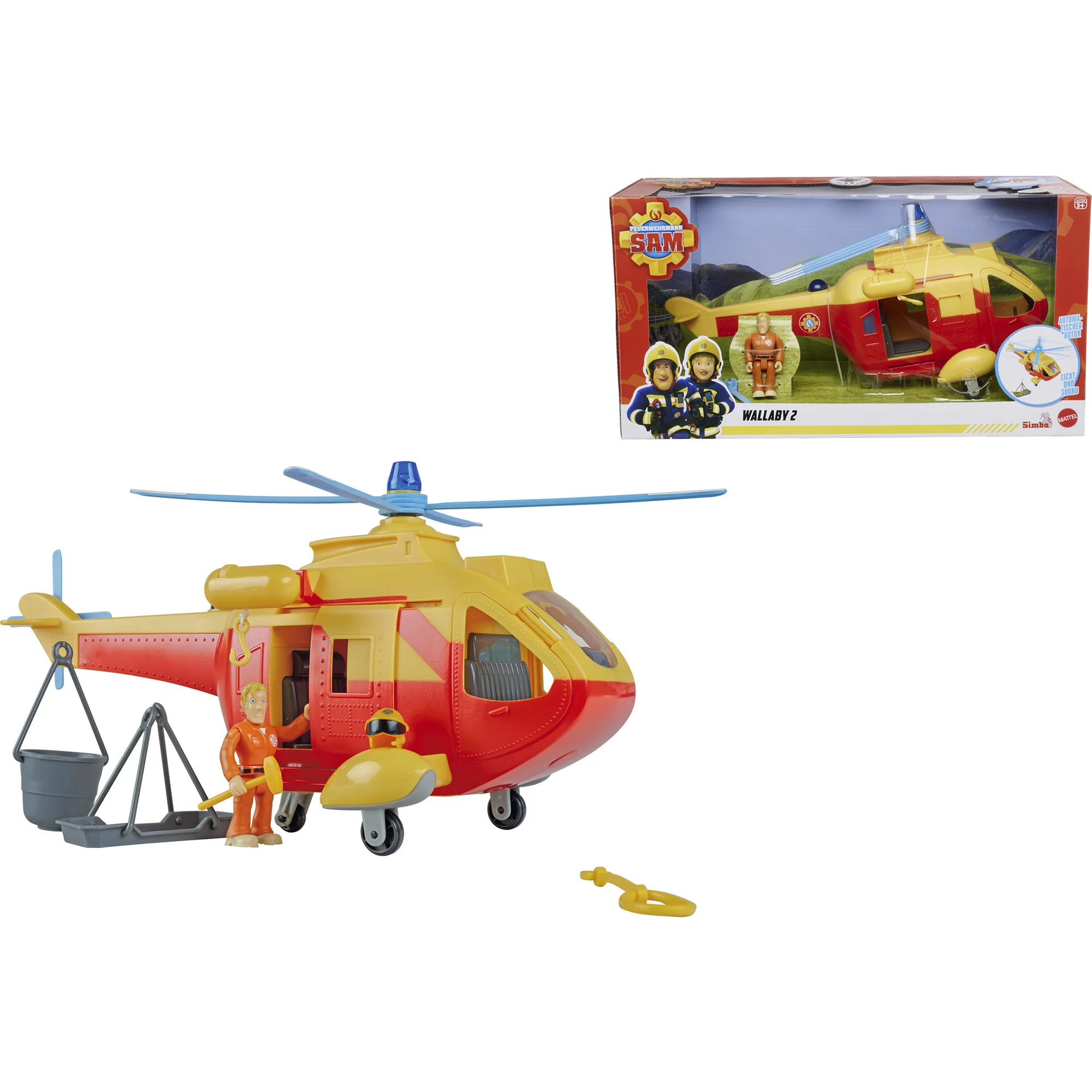 A helikopter sárga–narancssárga dizájnja hűen tükrözi a „Sam, a tűzoltó” sorozatban látható Wallaby 2 mentőjárművet. A gyerekek könnyen azonosítják a kedvenc történeteikből, így pillanatok alatt beleélik magukat a bajbajutottak megmentésébe. Tom, a pilóta figurájával (külön megvásárolható) a játék még teljesebb, de a helikopter önmagában is izgalmas szerepjátékra hív.