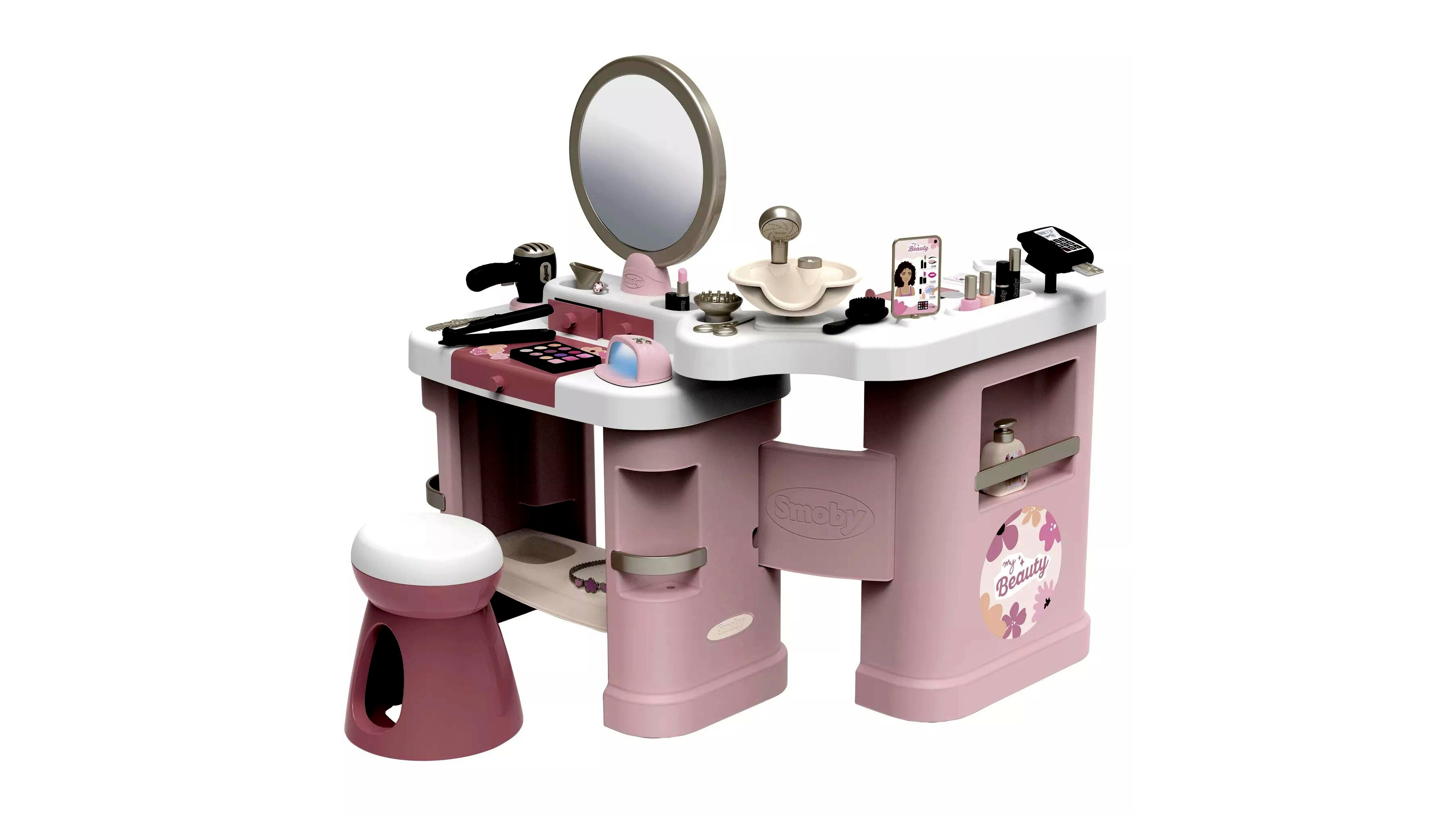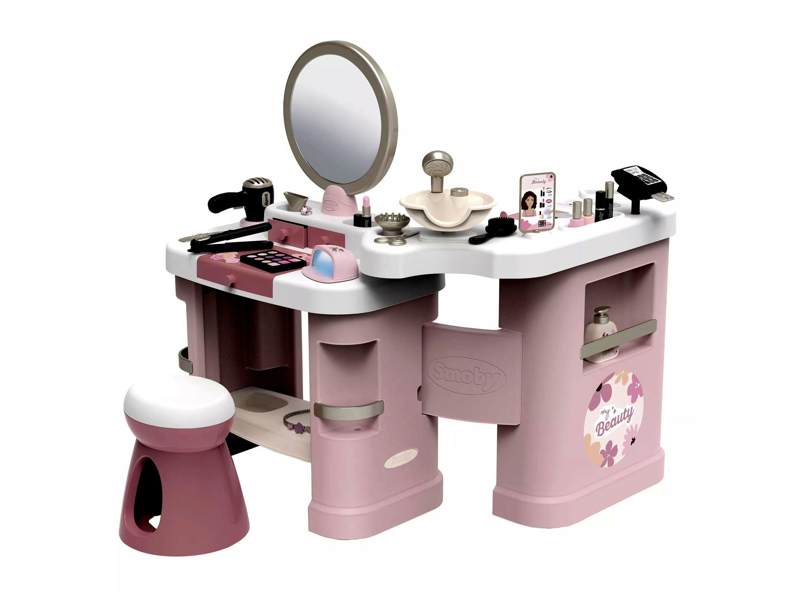 A Smoby My Beauty Center szépségszalon valódi wellness kezelések széles választékát kínálja: legyen szó sminkelésről, hajformázásról vagy körömdíszítésről, itt minden apró részlet megtalálható, amely segít a gyerekeknek, hogy kreatívak lehessenek és játékosan tanuljanak. A három különböző játékterület – smink- és fésülködőasztal, mosdóhely és pénztárgép – valósághűen megtervezett kiegészítőkkel van ellátva. A dönthető tükör és kényelmes szék biztosítja, hogy a gyermekek a lehető legkényelmesebb környezetben játszhassanak.