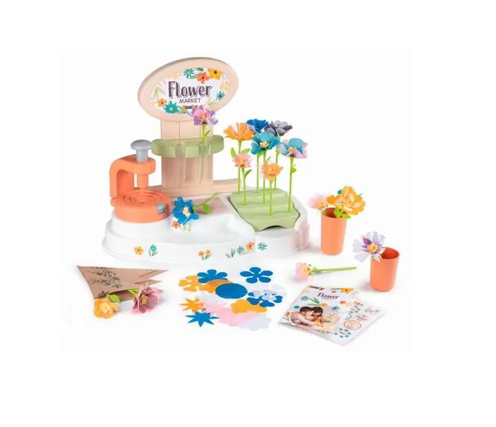 A kreatív Smoby virágpiac segítségével a 3 éves gyermekek megtervezhetik saját virágaikat, és szép csokrokká állíthatják össze őket. Az egyedi, mechanikus virágkészítő gép segítségével gyerekjáték újra és újra elkészíteni és összerakni a virágkreációkat: ehhez a szár felső rövid részét behelyezzük az alján lévő virágprésbe, és két szövetsziromot helyezünk a tetejére