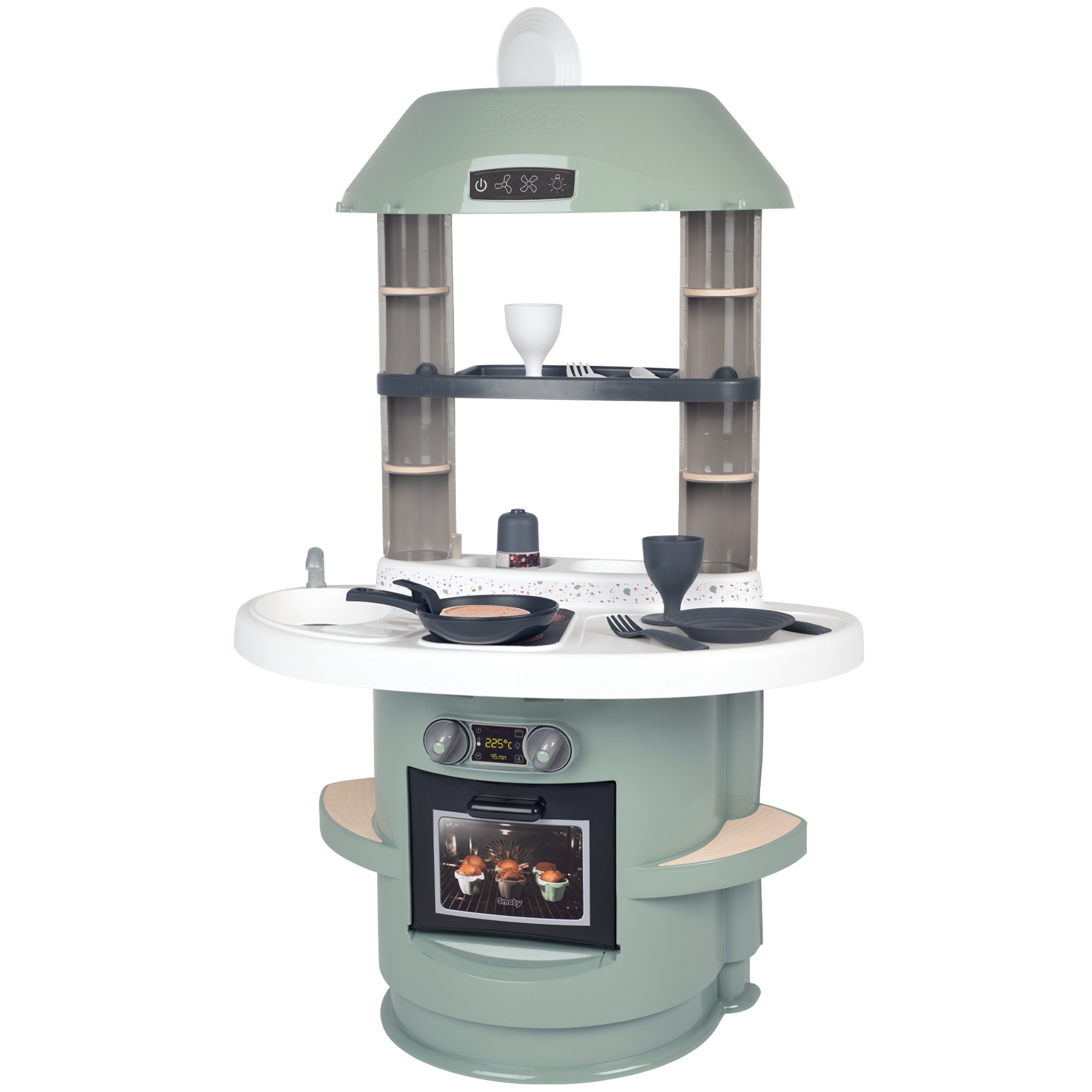 Játékkonyha 13 kiegészítővel. Rengeteg játéktér - asztallap, mosogató, sütő, polcok, palacsinta serpenyő, tányérok, evőeszközök, csészék és fűszerdaráló.