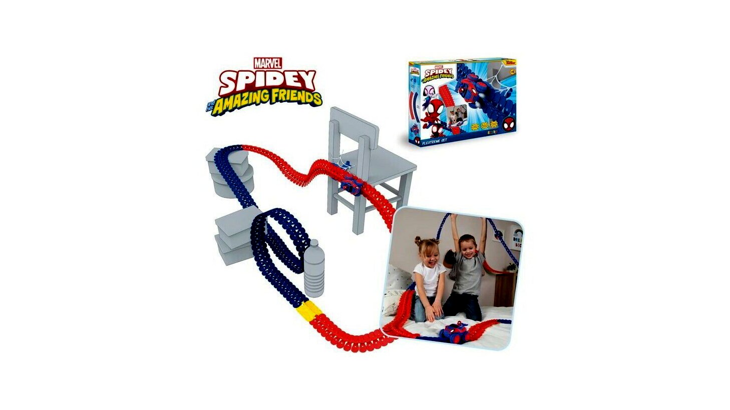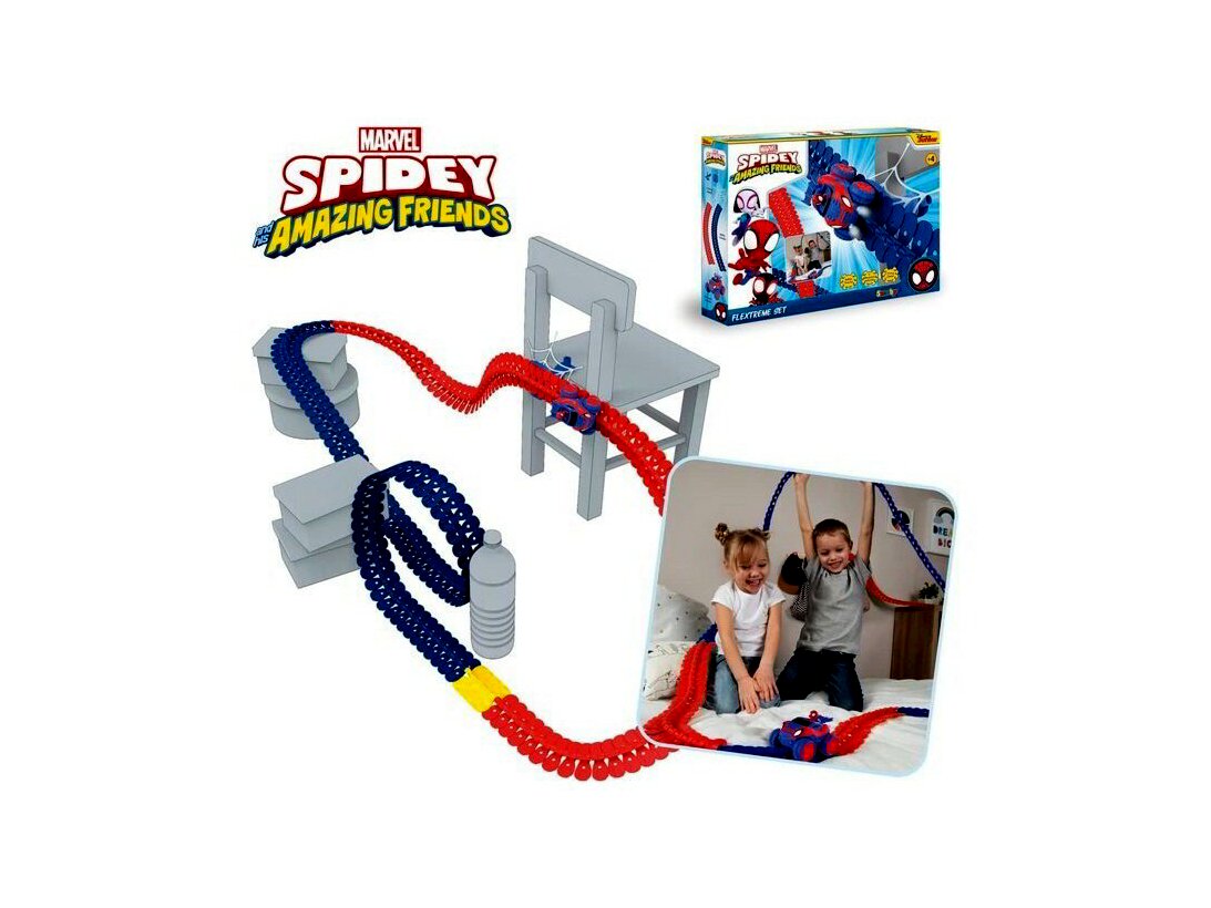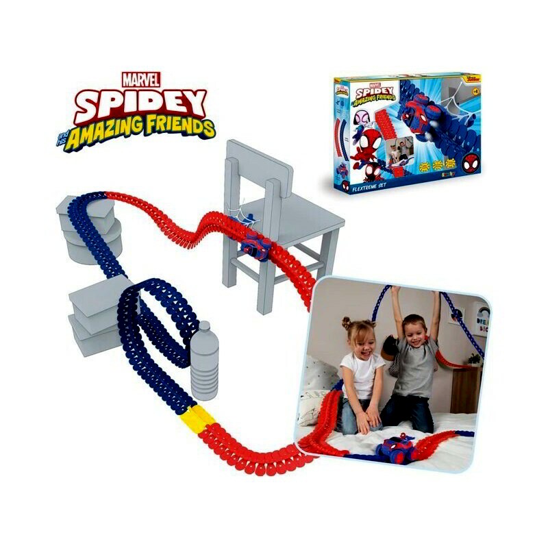 A készlet 184 sínalkatrészt, egy Spidey versenyautót és egy exkluzív, pókhálós rögzítőcsipeszt tartalmaz.