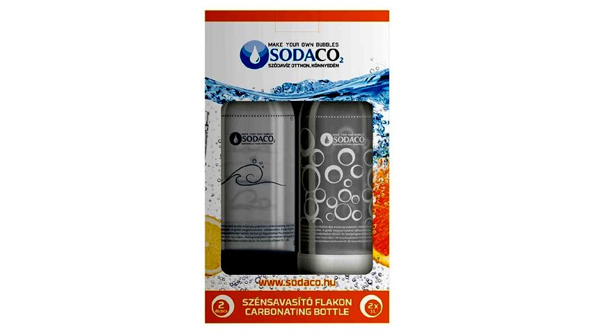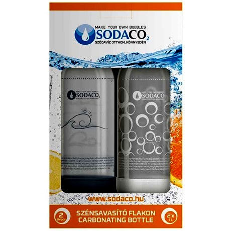 Üdvözölje otthonában a frissítő buborékokat a Sodaco szénsavasító flakon duopack segítségével! Ez a praktikus csomag két 1 literes PET flakont tartalmaz, amelyek tökéletesen illeszkednek a Sodaco Basic és Royal otthoni szódagépekhez.