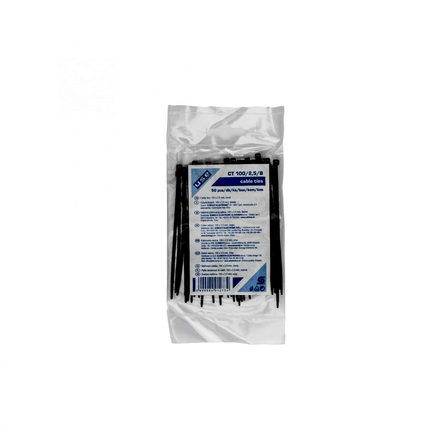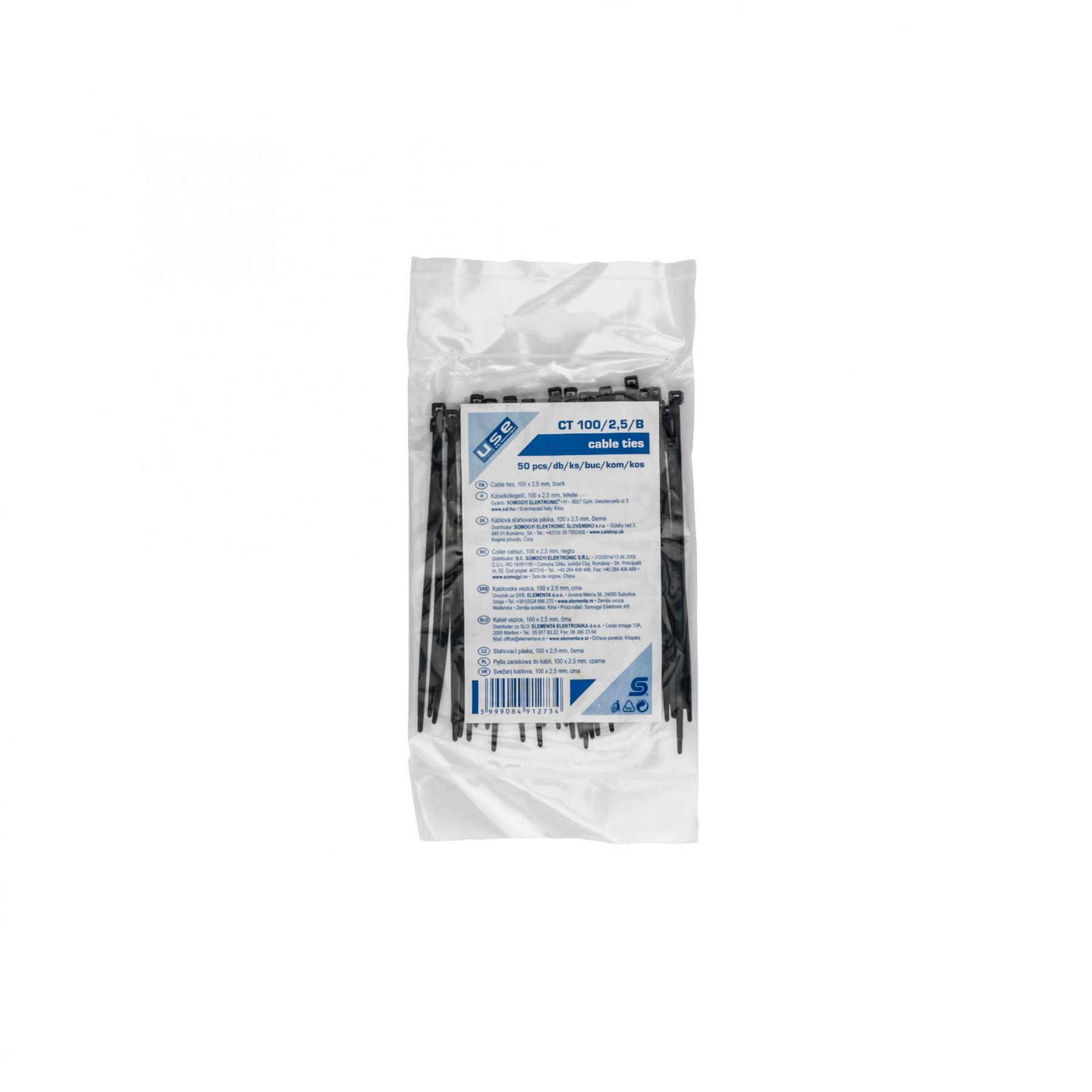 - A CT 100/2,5/B fekete színű kábelkötegelő, 100 mm hosszúságban, 2,5 mm szélességben, valamint 50 db/csomagban kapható.