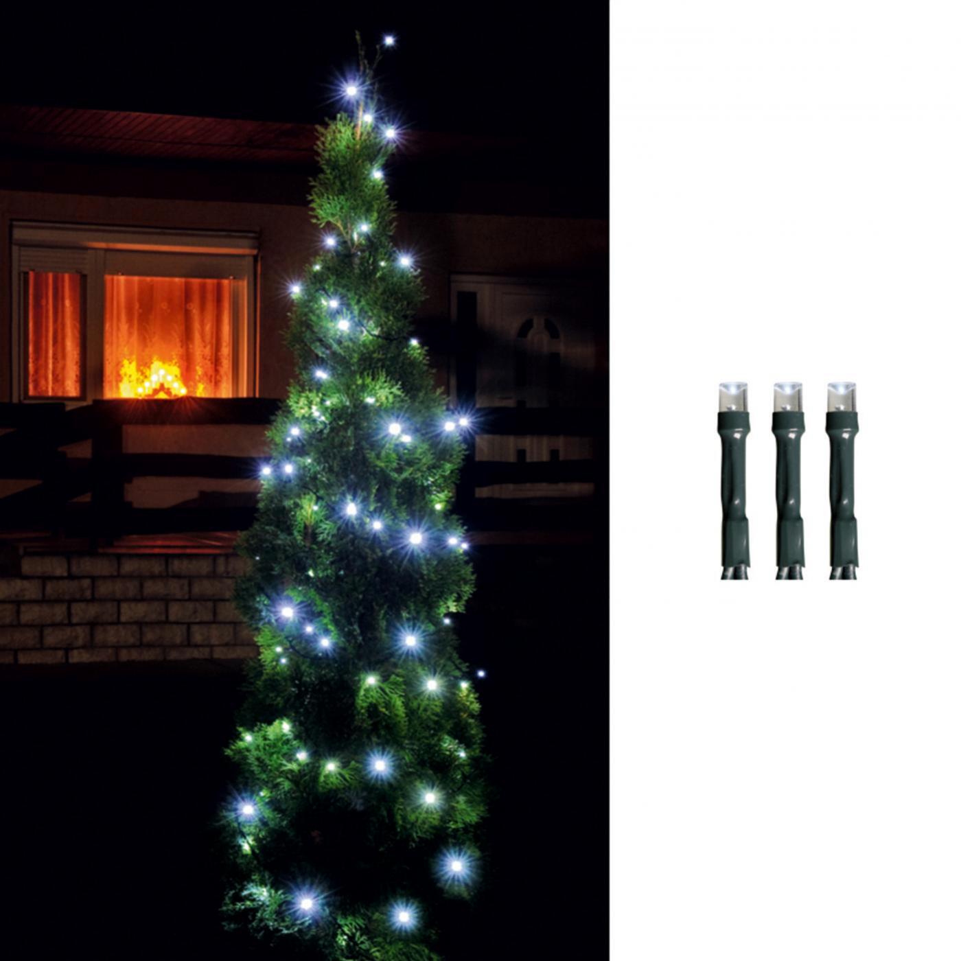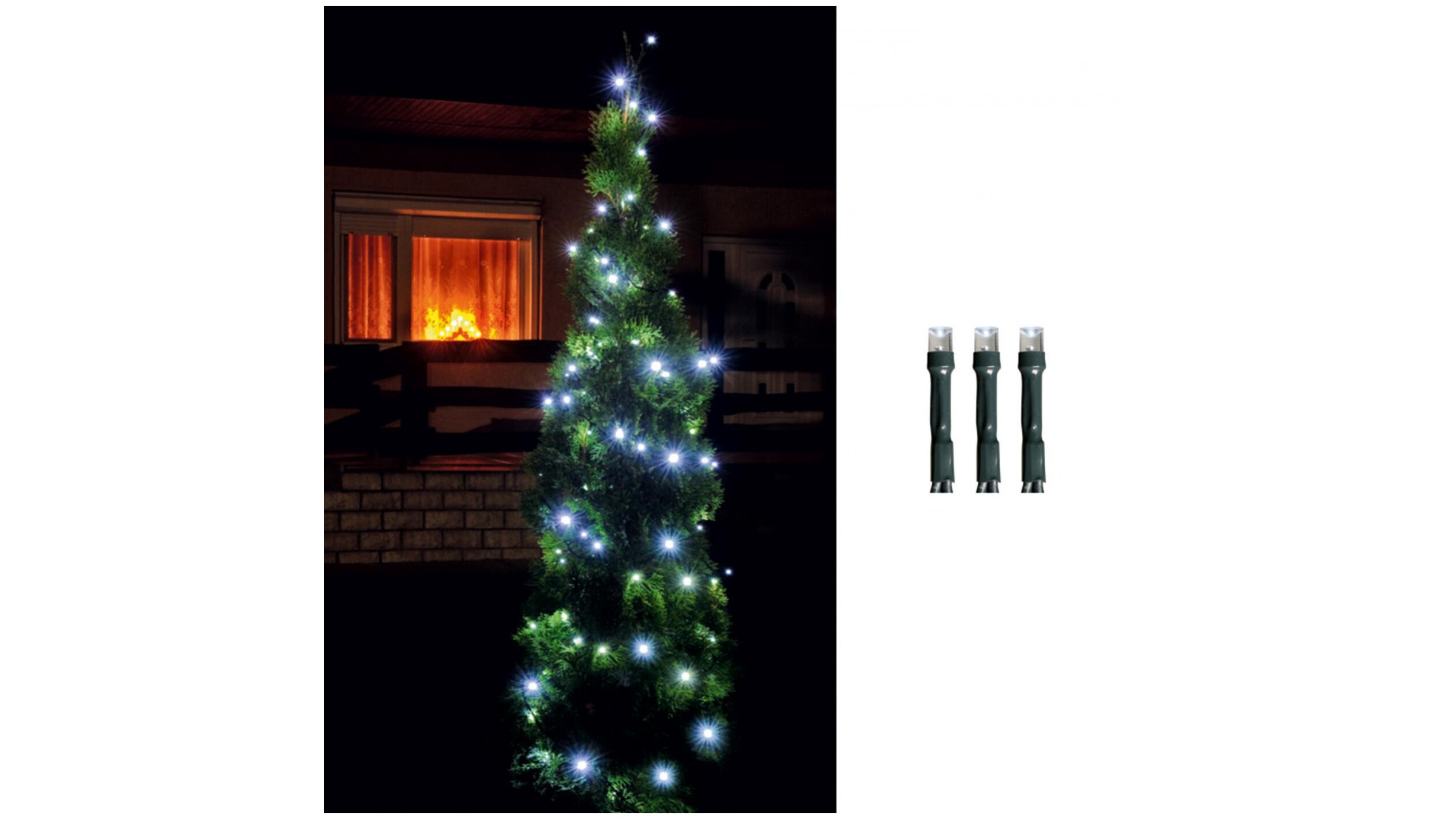 A zöld vezeték diszkréten simul a karácsonyfa környezetébe, így csak a 100 db hidegfehér LED ragyogása érvényesül. A kültéri IP44-es hálózati adapter gondoskodik az állandó és biztonságos működésről.