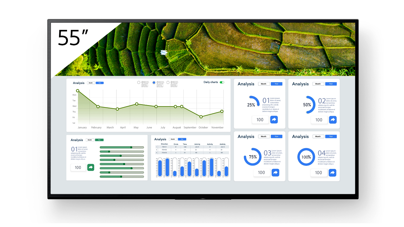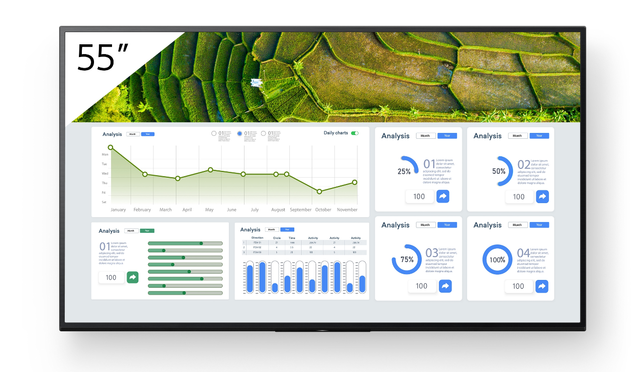 Az FW-55BZ30L karcsú, minimalista kialakítása kifogástalan stílust hoz bármilyen üzleti környezetbe. A kijelző elegáns vonalait praktikus vonásai tovább erősítik a zökkenőmentes integráció érdekében a kiskereskedelmi üzletekben, főiskolákon és vállalati munkaterületeken.