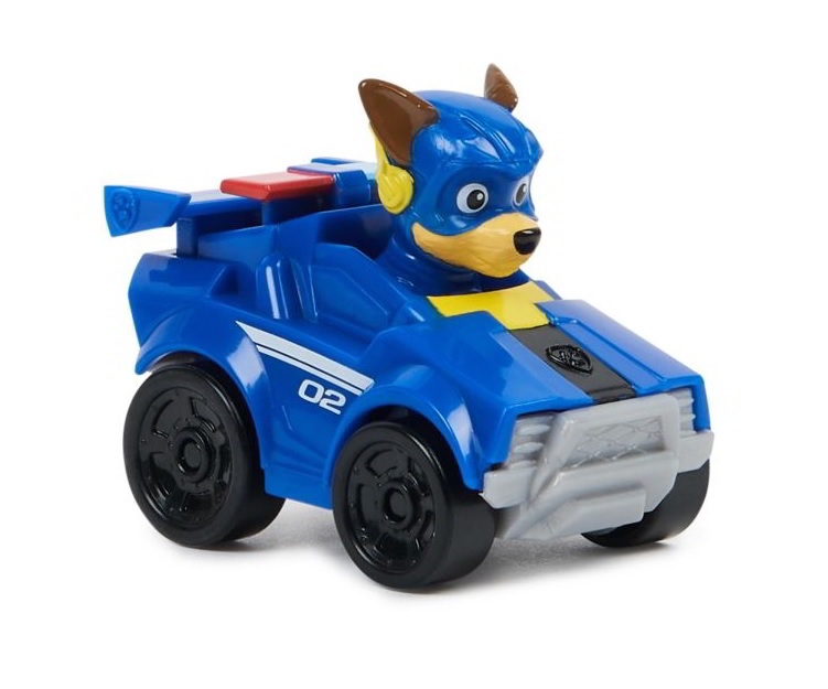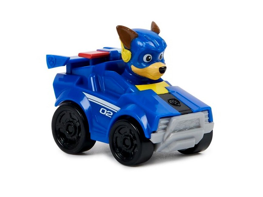 A versenyautók mindegyike a benne ülő tulajdonosához illik: élénk színeik és igényes kivitelezésük is hűen idézi az animációs filmben látottakat. Az 1:64 méretarányú kisautók strapabíró műanyagból készültek, így a gyerekek sokáig élvezhetik majd a velük való játékot. A figurák nem vehetők ki a járművekből. Ebben a csomagban Chase járműve kapott helyet. Vigyázz, kész... Kutyafutamra fel!