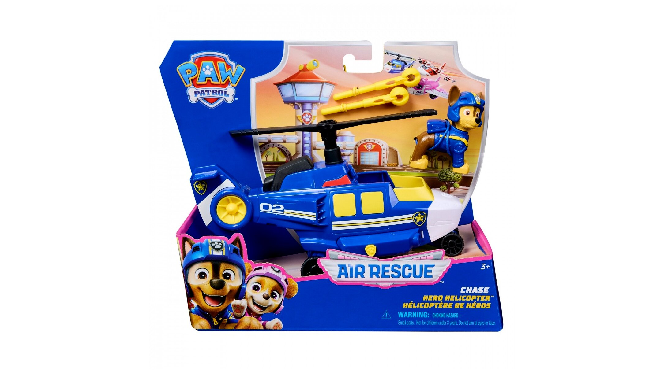Air Rescue Chase több mint 2 hüvelyk magas, és teljes mértékben felszerelt a kék repülőkabátjával és sisakjával, hogy felkészült legyen minden mentőakcióra. Az interaktív ágyúval, amely két mentőlövedéket is tartalmaz, a gyerekek valósághű módon újraélhetik a PAW Patrol izgalmas mentéseit.