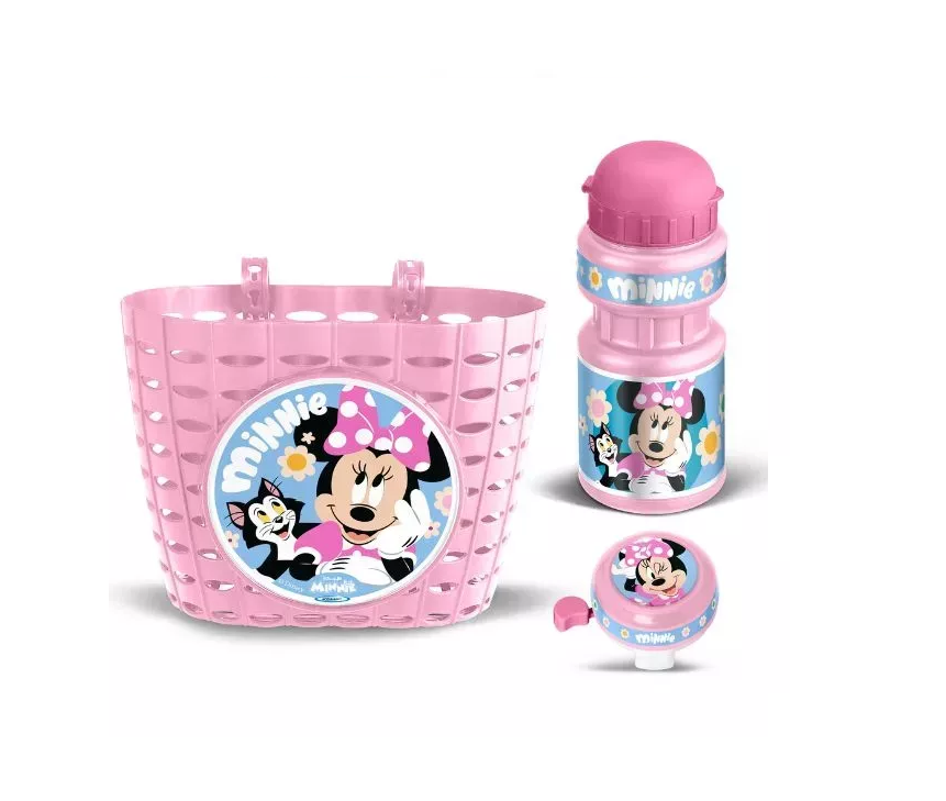 • Teljes, összeillő szett: kosár, kulacs tartóval és csengő Minnie egér mintával