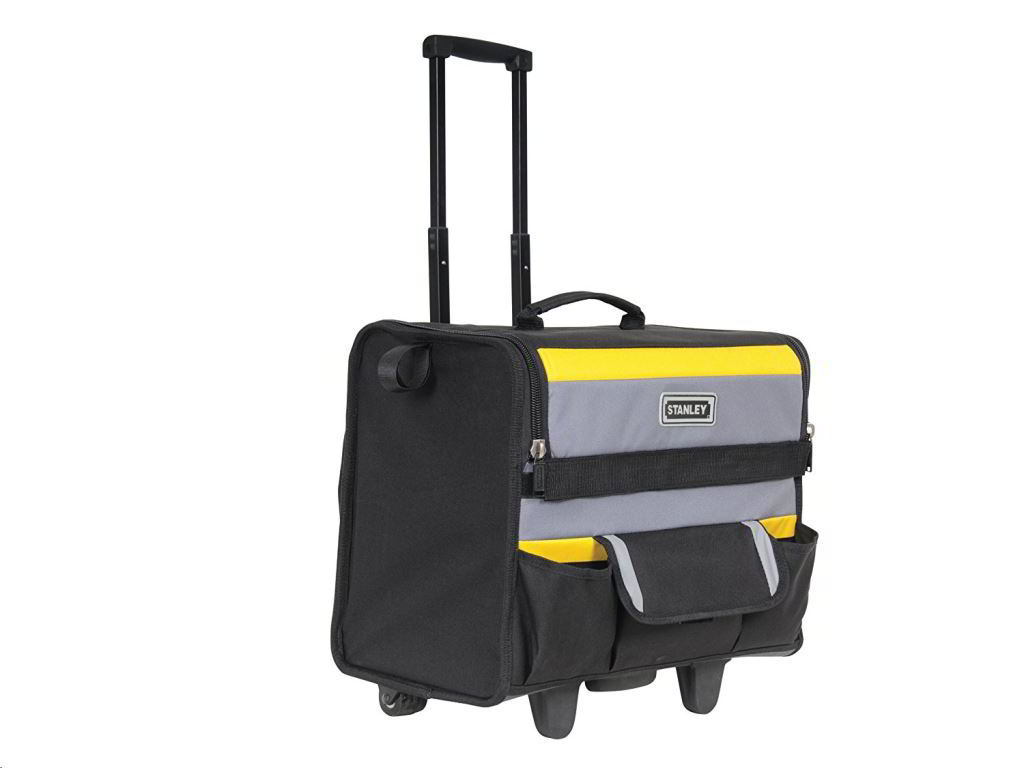 Stanley 18"-os kerekes szövet szerszámos táska. 600x600 dernier szövet. Merev falú a biztos tárolás érdekében. Könnyű mozgatás a teleszkópos nyél, és a kerekek állttal. Külső és belső tároló zsebek. Kivehető belső tépőzáras térelválasztó.