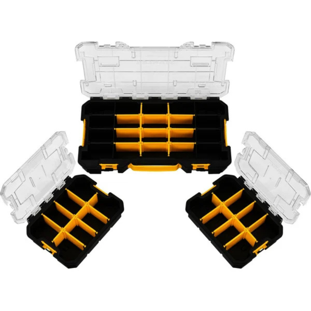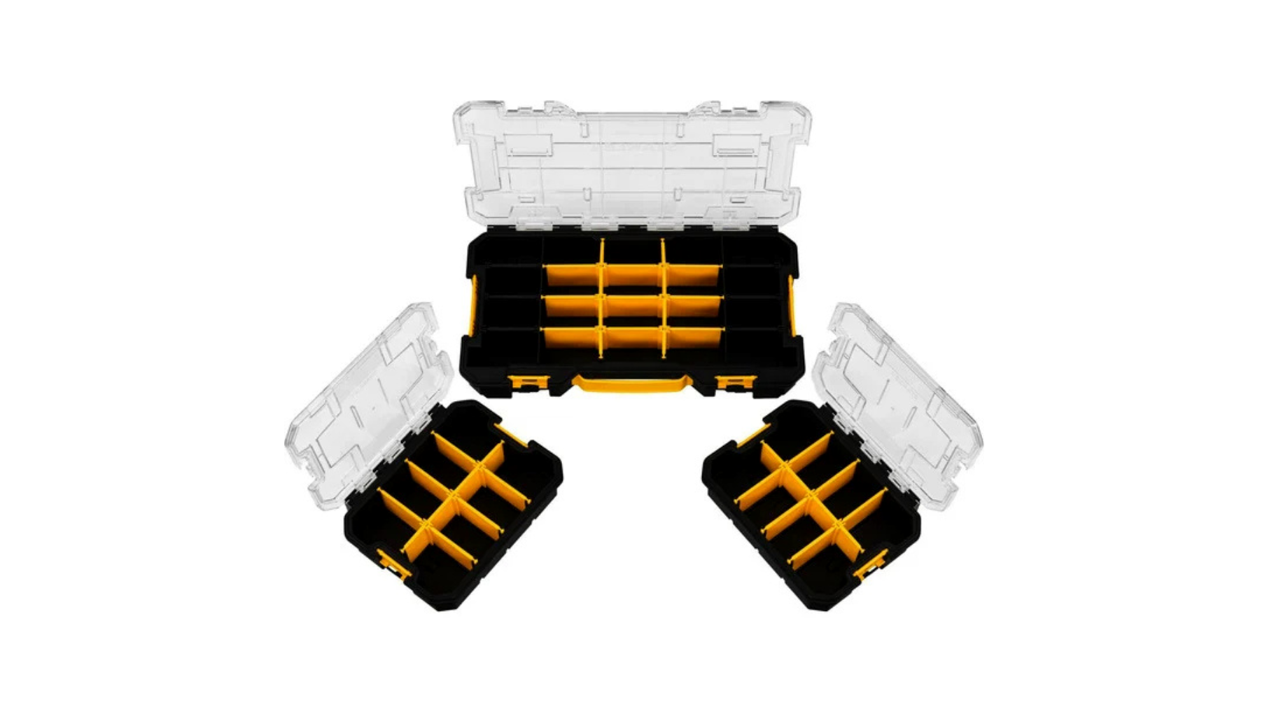 A készlet egy nagyméretű és két kisméretű FATMAX PRO-STACK rendezőt tartalmaz, amelyek egymással és más PRO-STACK elemekkel is összekapcsolhatók. A robusztus oldalsó záraknak köszönhetően több PRO-STACK modul stabilan, „toronyként” egymásra rakható, így a tárolórendszer rugalmasan bővíthető, személyre szabható.