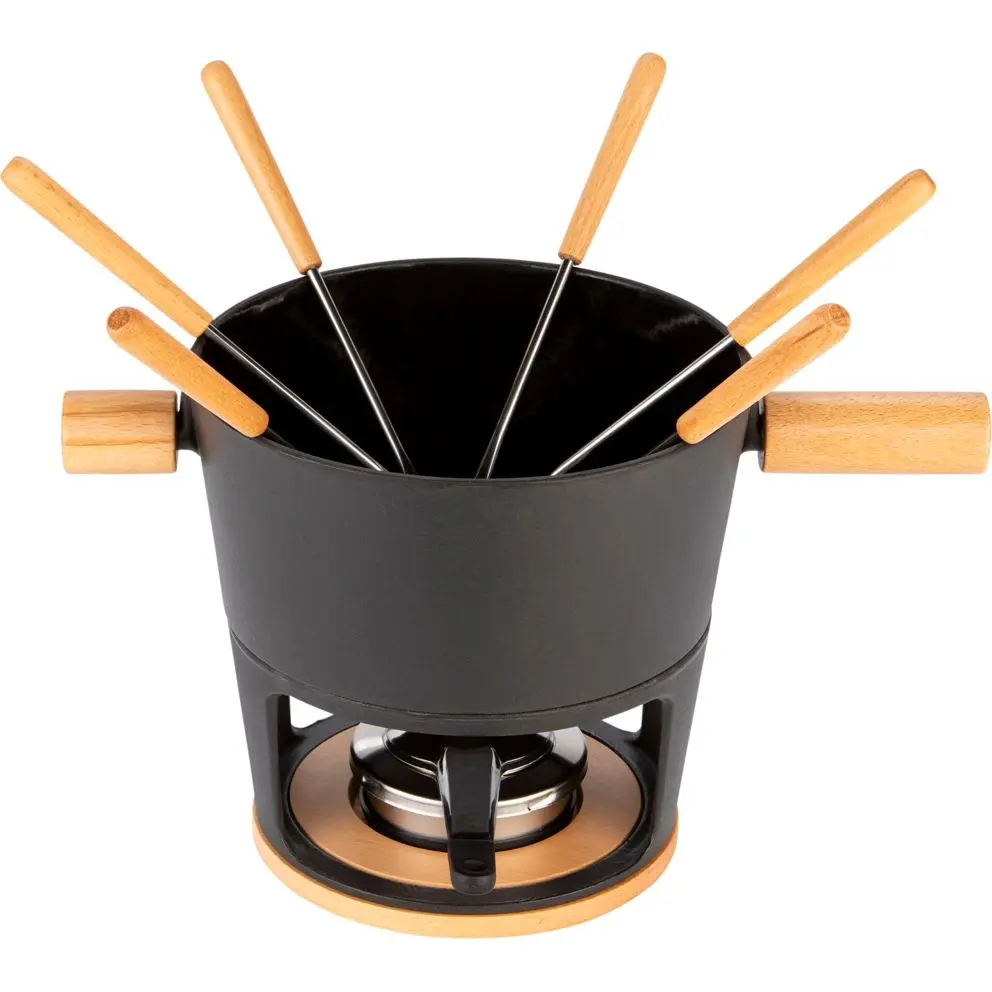 A Stöckli Käsefonduegarnitur Titlis Big szett ideális választás a sajt fondue szerelmeseinek. Az elegáns fekete színben kapható szett 3,2 literes kapacitásával tökéletes választás nagyobb családi vagy baráti összejövetelekhez. A svájci Stöckli márka híres kifinomult és megbízható konyhai eszközeiről, így biztos lehet benne, hogy ezzel a készlettel a legjobb minőséget és tartósságot kapja.