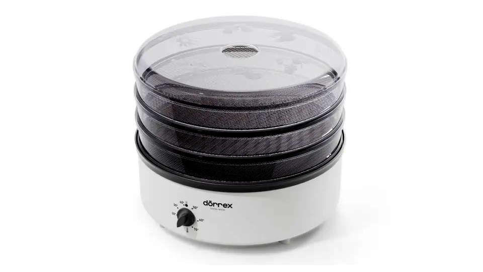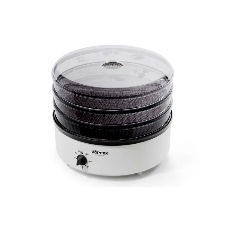 Az Stöckli Dörrex aszalóval három rozsdamentes acél tálcával rendelkezik, könnyen tisztítható műanyag házzal, szabadon állítható hőmérséklet-tartománnyal és aktív meleg levegő keringéssel. Az átlátszó fedélre nyomtatott különböző aszalási idők segítenek a megfelelő szárítási idő elérésében minden gyümölcs és zöldség esetében. Kapacitás: az eszköz akár tíz szárítóráccsal is használható.