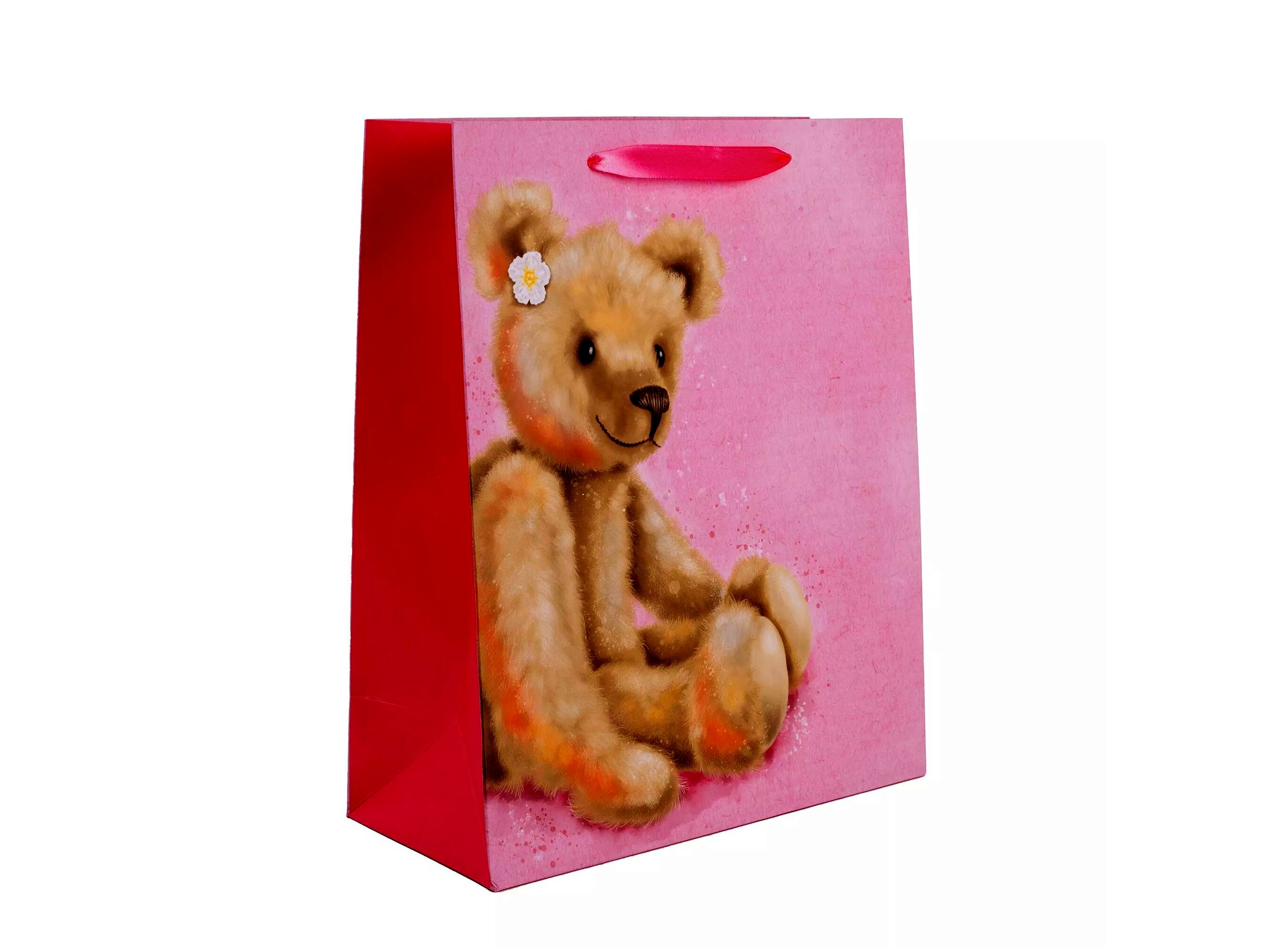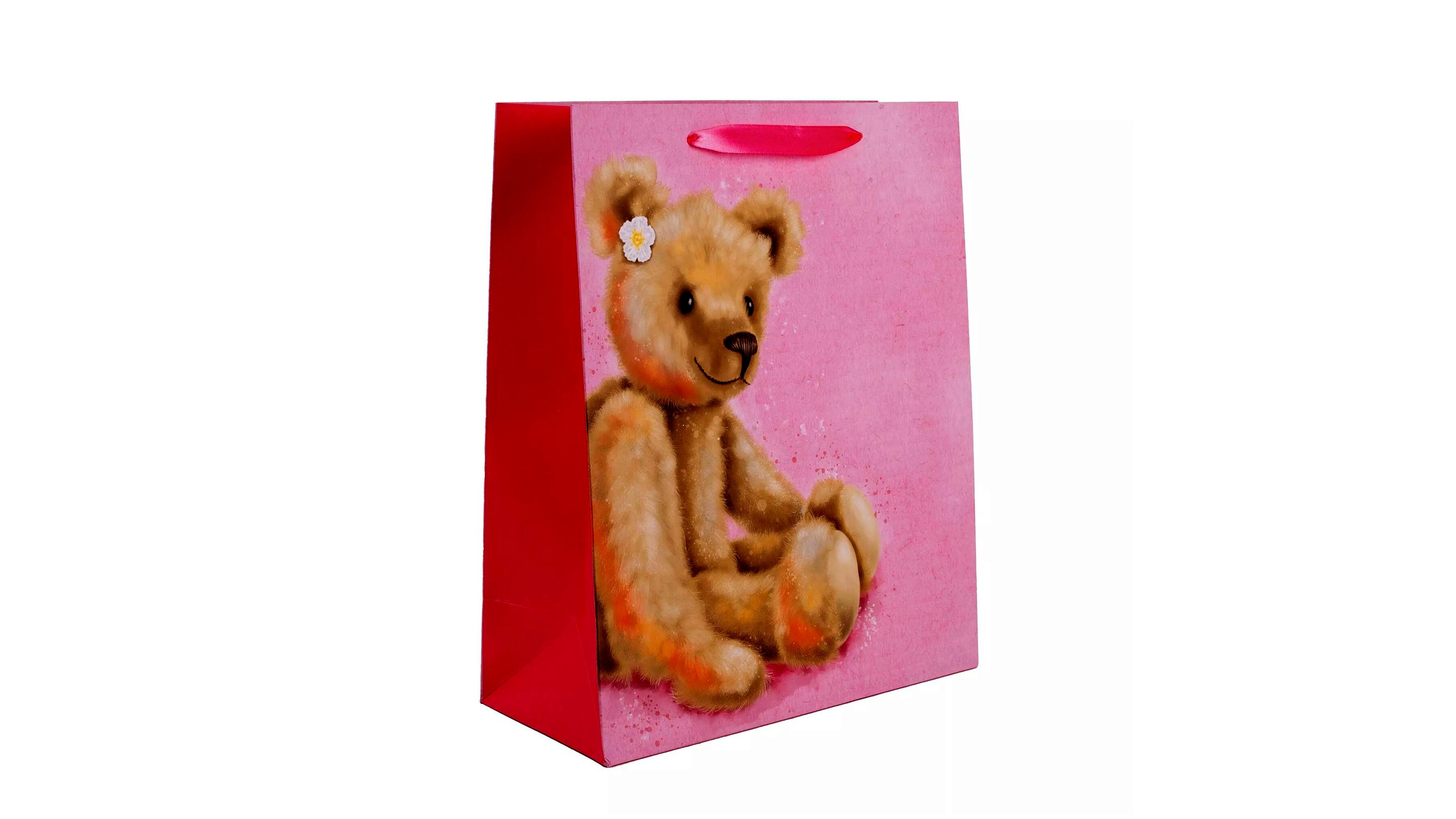Csodálatos Nosztalgia maci mintával díszített ajándéktasak tökéletes választás minden alkalomra! A rózsaszín alapszínű, szalagfüles papírtasak különleges megjelenésével bármilyen ajándékot egyedivé varázsol. A klasszikus maci grafika nosztalgikus hangulatot kelt, amely minden korosztály számára örömet okoz.