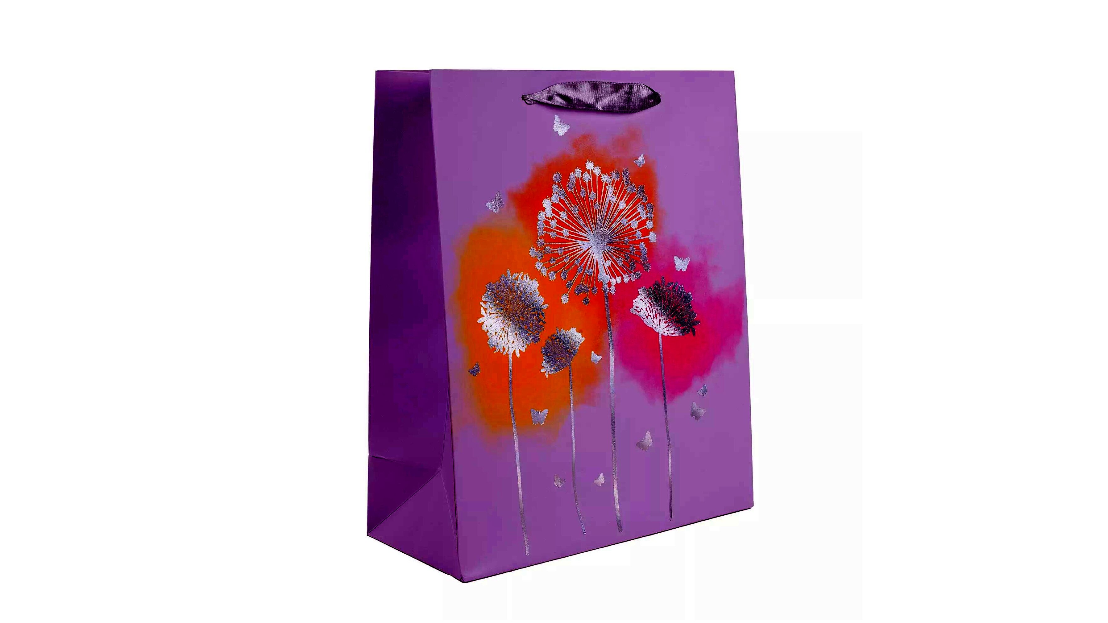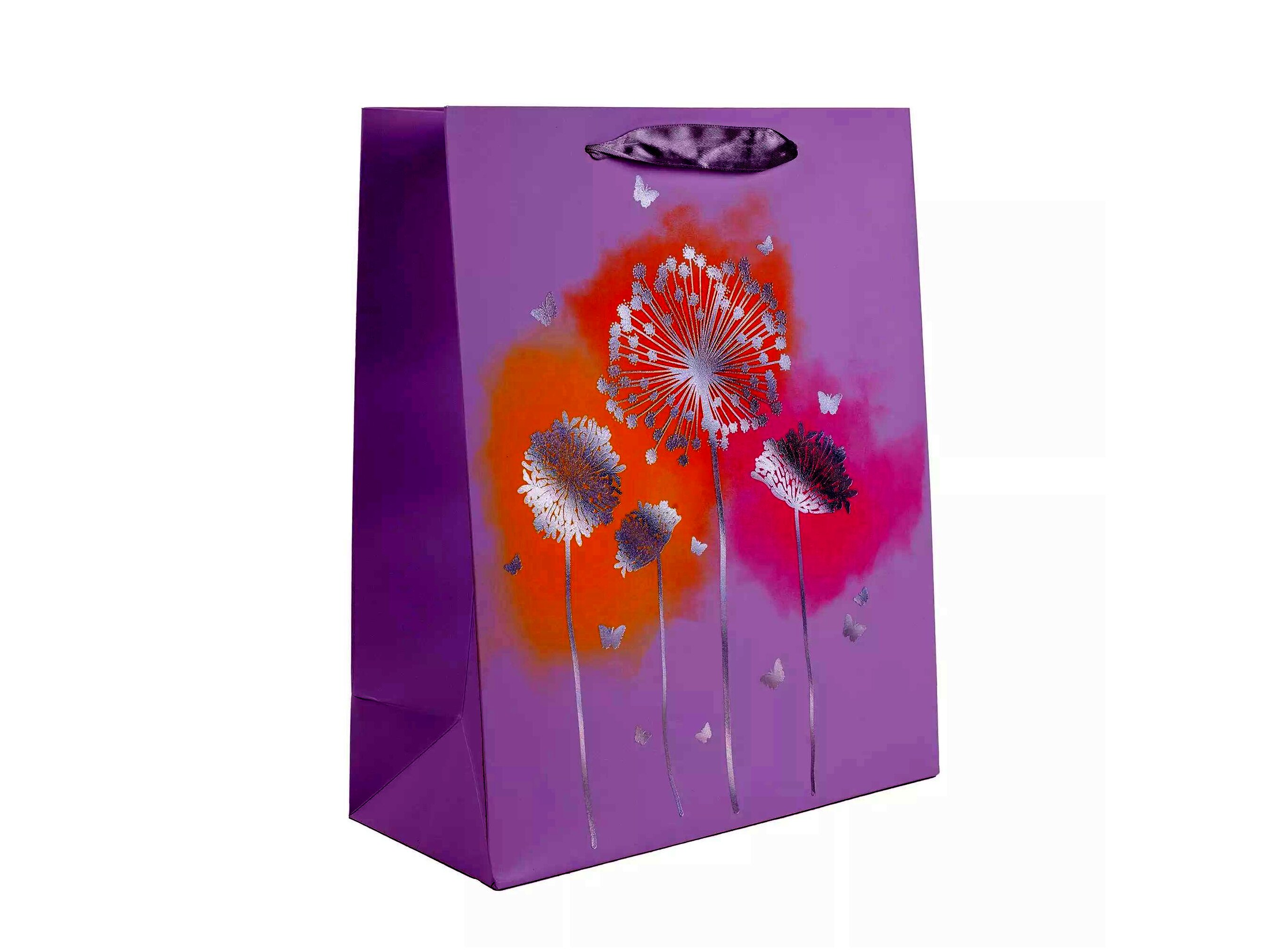 A szalagfüles papír ajándéktasak tökéletes választás, ha egyedi és látványos csomagolást szeretnél az ajándékodnak. A pitypang hologramos mintázatával biztosan lenyűgözi a megajándékozottat, ráadásul a rózsaszín és mintás design modern és elegáns megjelenést biztosít.