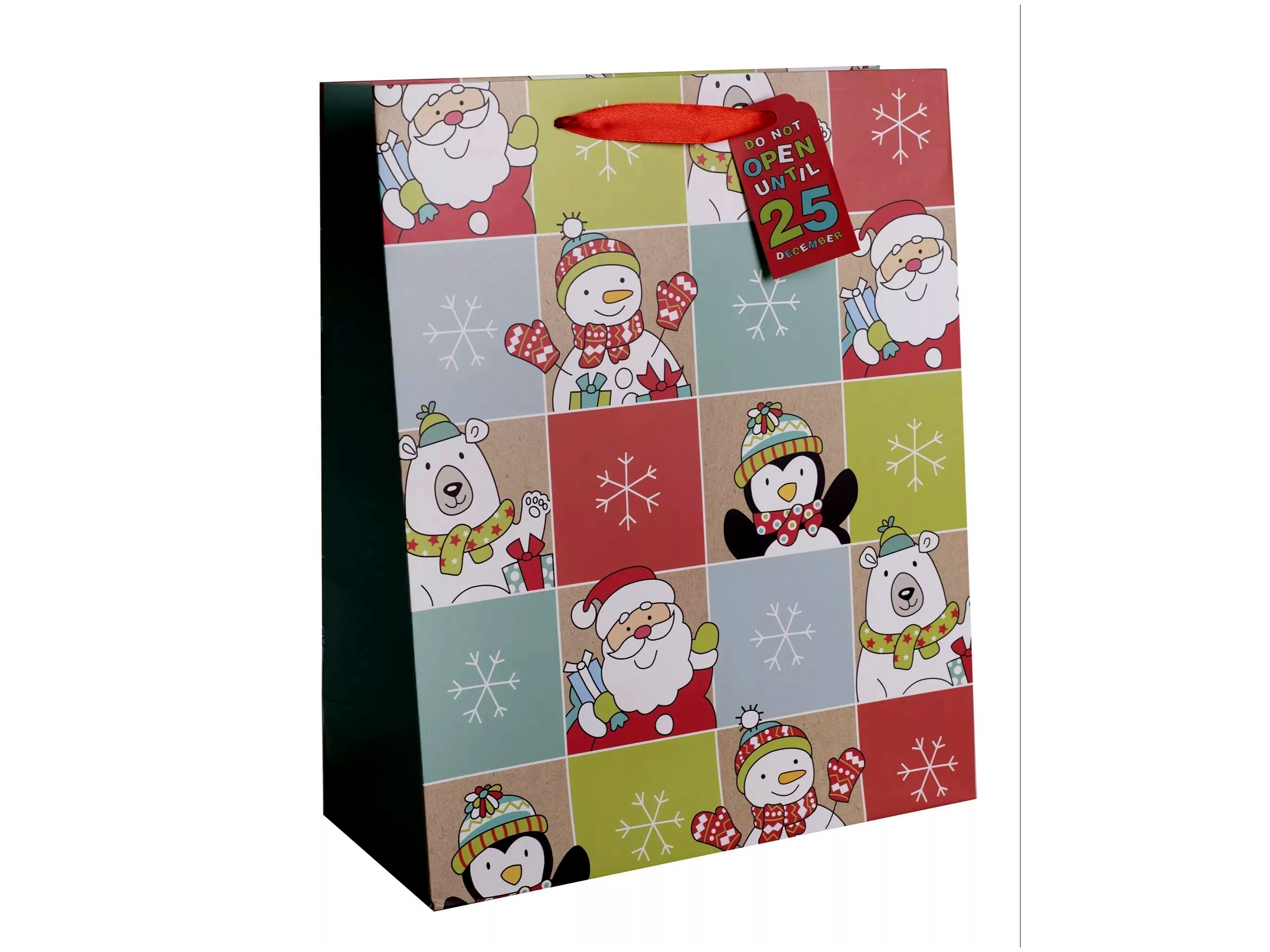 Ez a színes karácsonyi mintákkal díszített ajándékzacskó szalagfüllel igazi örömöt csempész az ünnepekbe. Nemcsak esztétikus, de praktikus is, hiszen többször felhasználható, így kevésbé terheli a környezetet, mint a hagyományos csomagolópapír. Tökéletes választás, ha valami különlegeset keresel szeretteid számára.