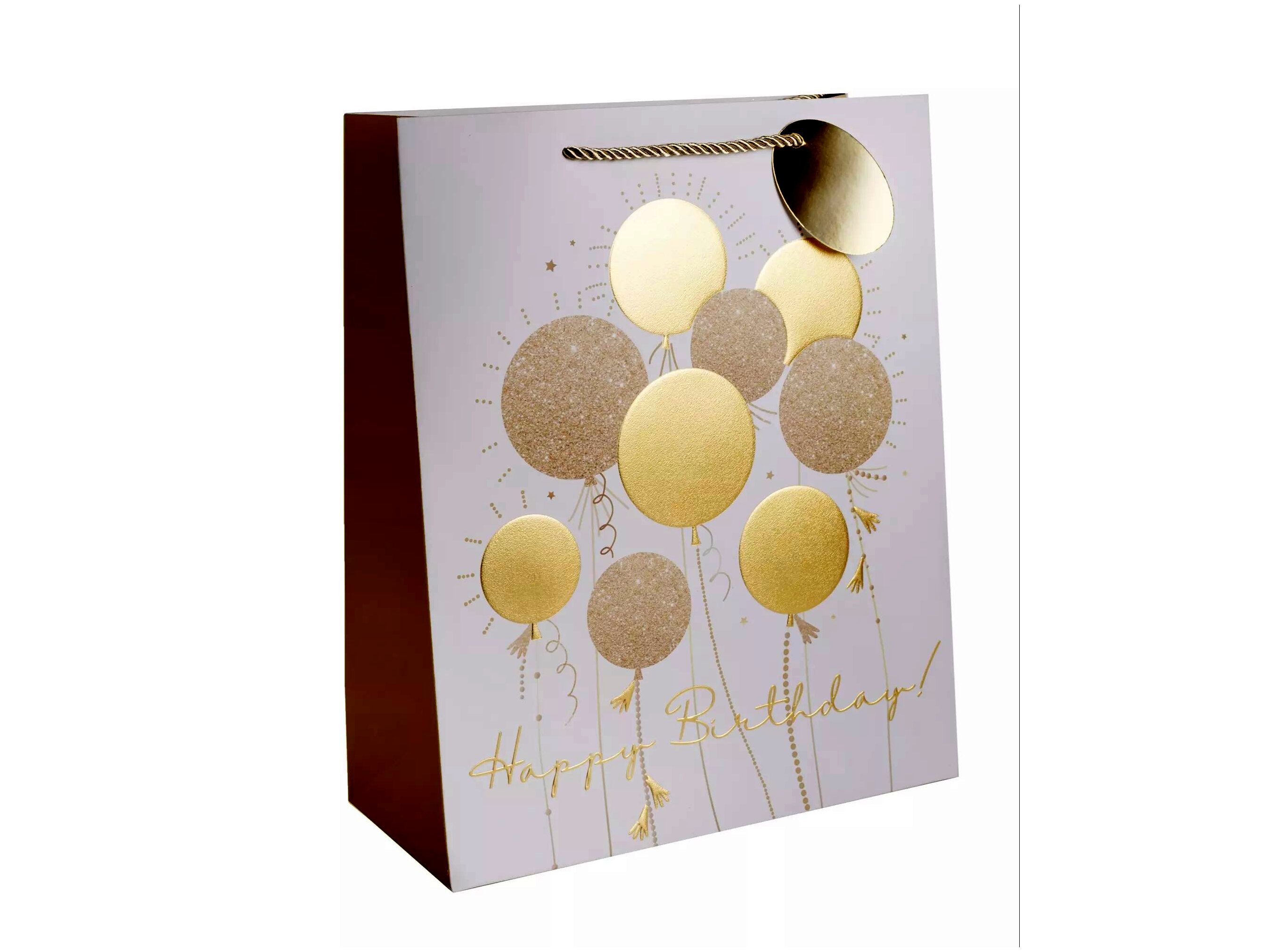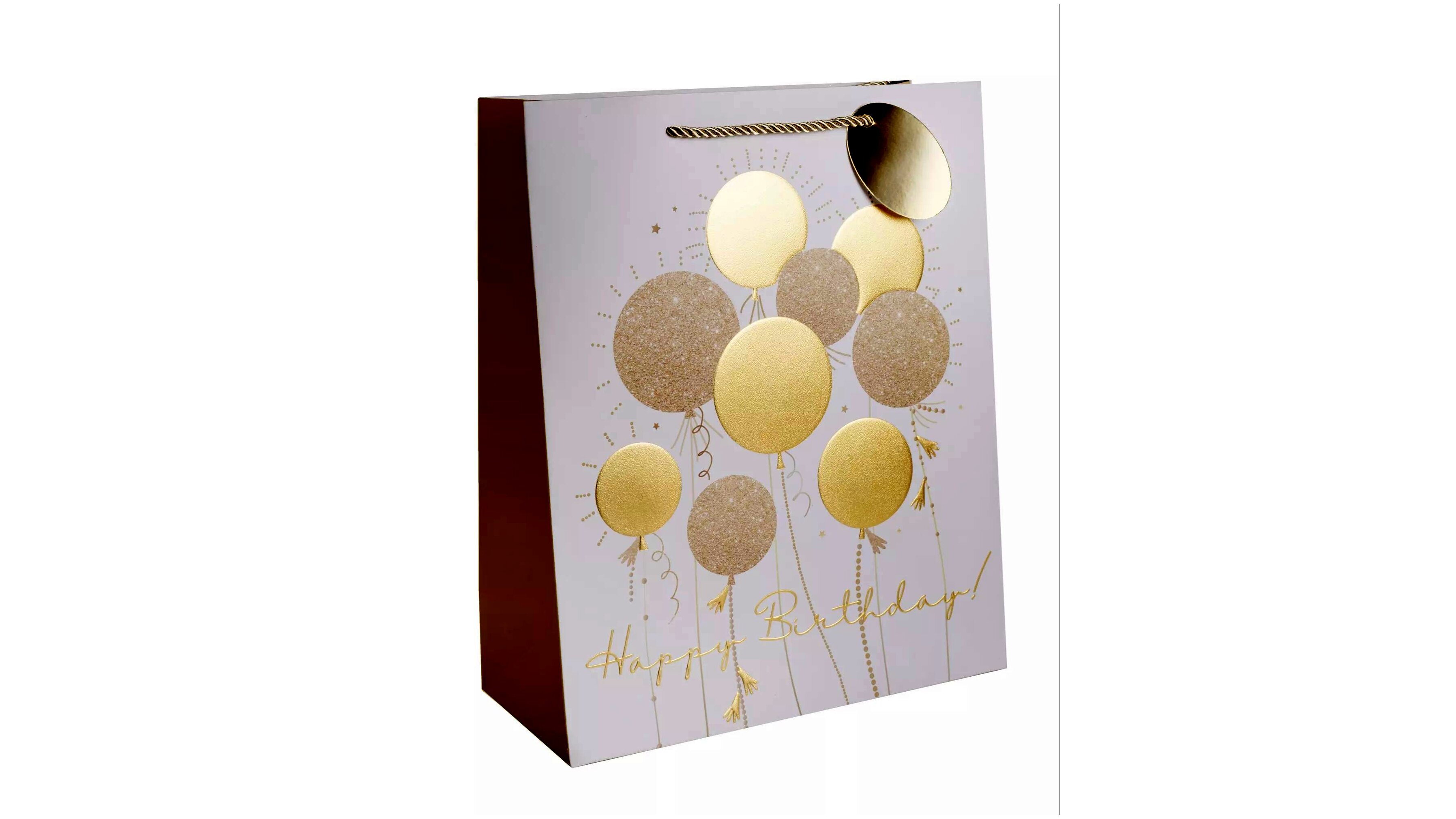 A tasak praktikus és elegáns megoldást nyújt ajándékaid csomagolására. Az arany színű lufik és a "Happy Birthday" felirat fiatalos és modern hangulatot kölcsönöznek. A szalagfüles madzag fül nem csak stílusos, de kényelmessé is teszi a tasak hordozását.