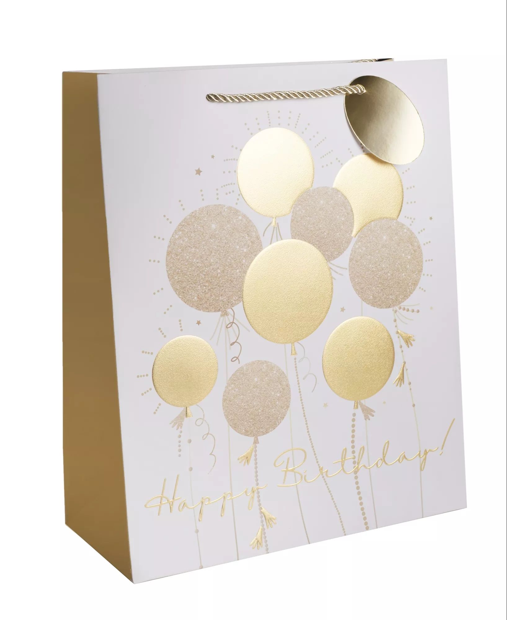 Ünnepeld a születésnapokat stílusosan ezzel a gyönyörű, Happy Birthday feliratos szalagfüles papír ajándéktasakkal! Az arany/fehér színösszeállítás és az arany lufikat ábrázoló design igazán különlegessé teszi ezt a tasakot. Mérete tökéletes kisebb ajándékok számára, így garantáltan emlékezetessé teszi az ajándékozást.