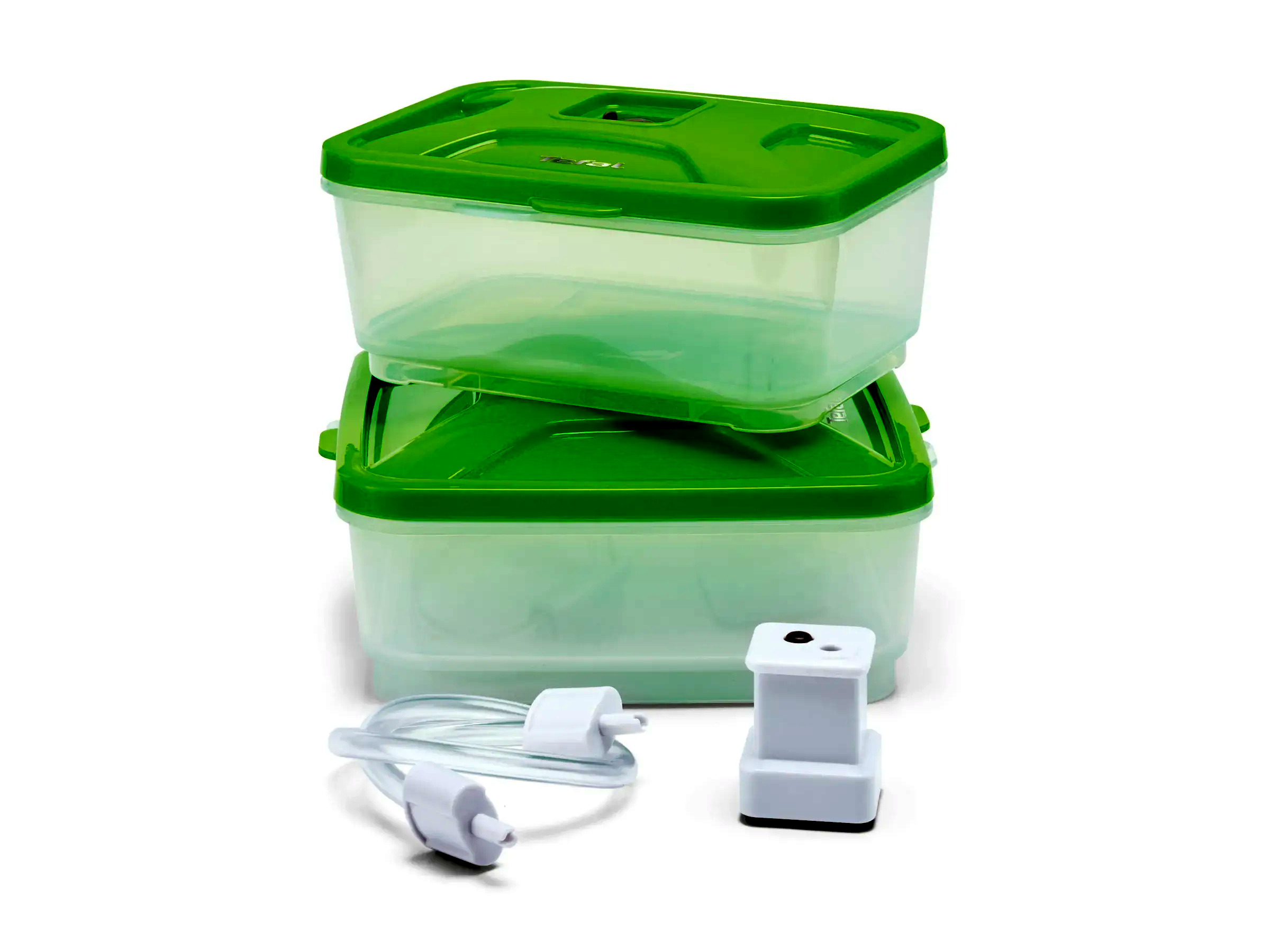 A készlet tartalmaz egy szívófejet is, amely a vákuumhatás létrehozásáért felel. Ez a technológia megakadályozza az oxidációt és a baktériumok elszaporodását, ezzel hosszabbítva meg ételeink eltarthatóságát.