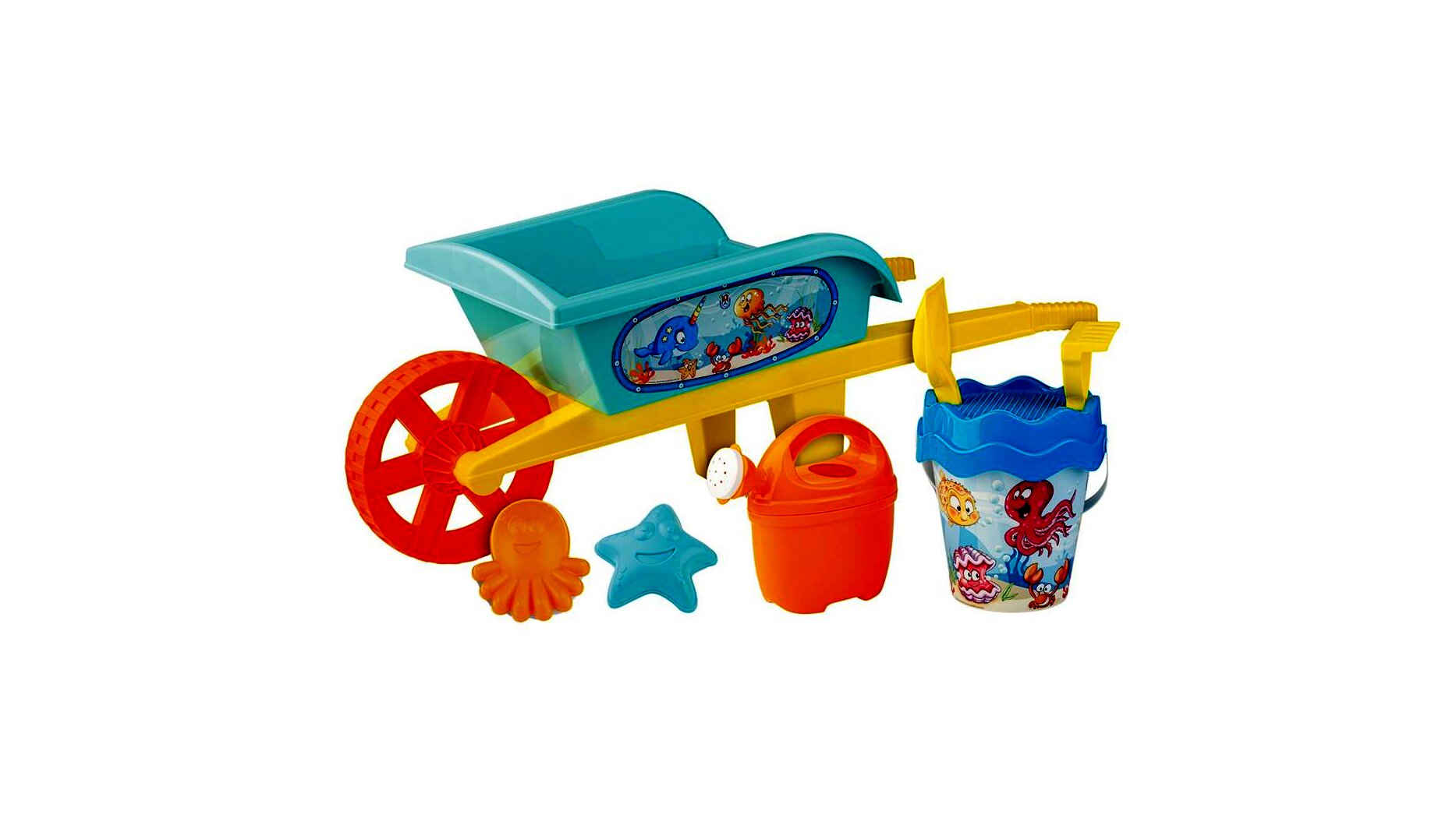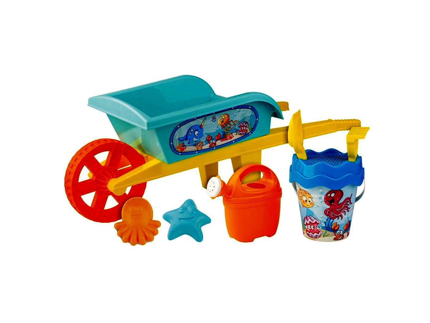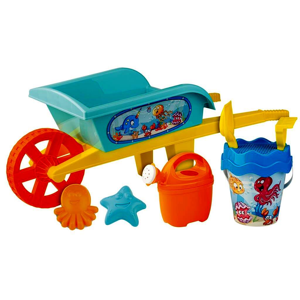 Vidám tengeri állat mintás homokozó szett, amely egyaránt használható a kertben, a strandon vagy a tengerparton. Vastag, strapabíró műanyagból készült, a talicska pedig megkönnyíti a szállítást.