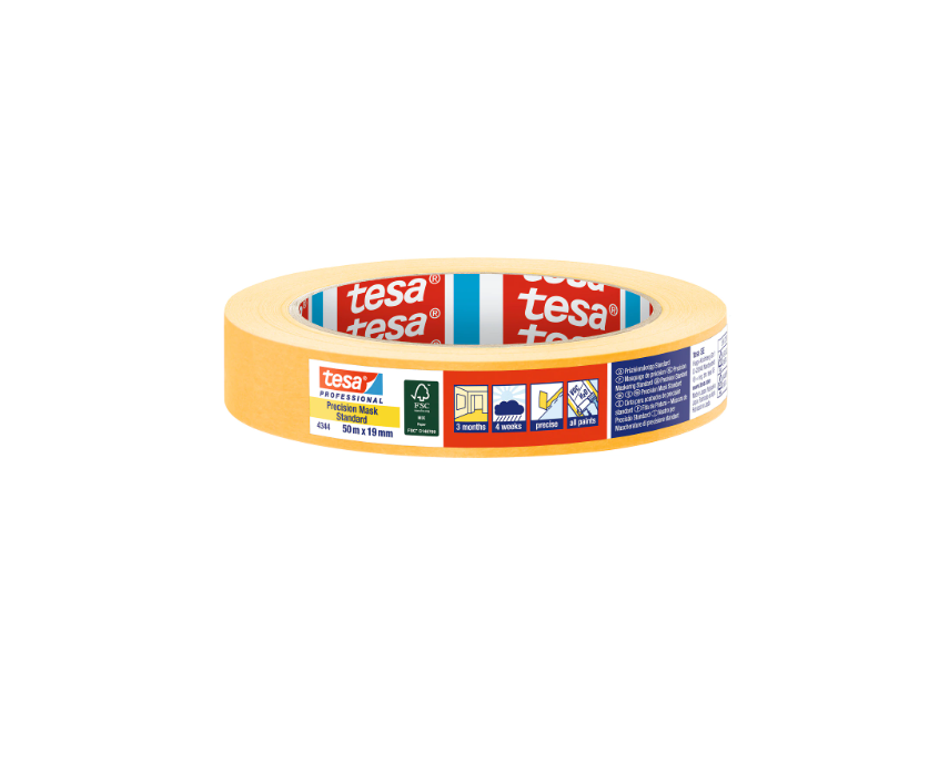 A tesa® 4344 Precision Mask® Standard extra vékony, mégis robusztus papírhordozóval és akrilát ragasztóval készülő profi maszkolószalag, amelyet kifejezetten éles, pontos festékszegélyek kialakításához terveztek. Ideális választás beltéri falfestéshez, lakkozáshoz, finom dekorációs munkákhoz, illetve rövidebb távú kültéri alkalmazásokhoz is.