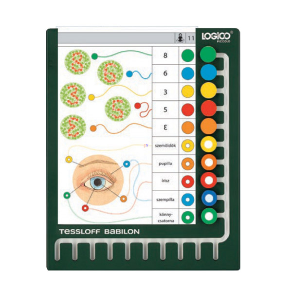 A Logico Piccolo keret bármely Logico Piccolo feladatkártyával együtt használható, 6 db színes koronggal ellátott állvány. A korongok segítségével a feladatkártyákat nem kell összefirkálni, újra lehet használni, a korongok segítik a feladatok pontos megjelölését. A pályán tologatott korongok segítik a kézügyesség fejlődését is. Méretek: 22 x 27 x 1 cm.