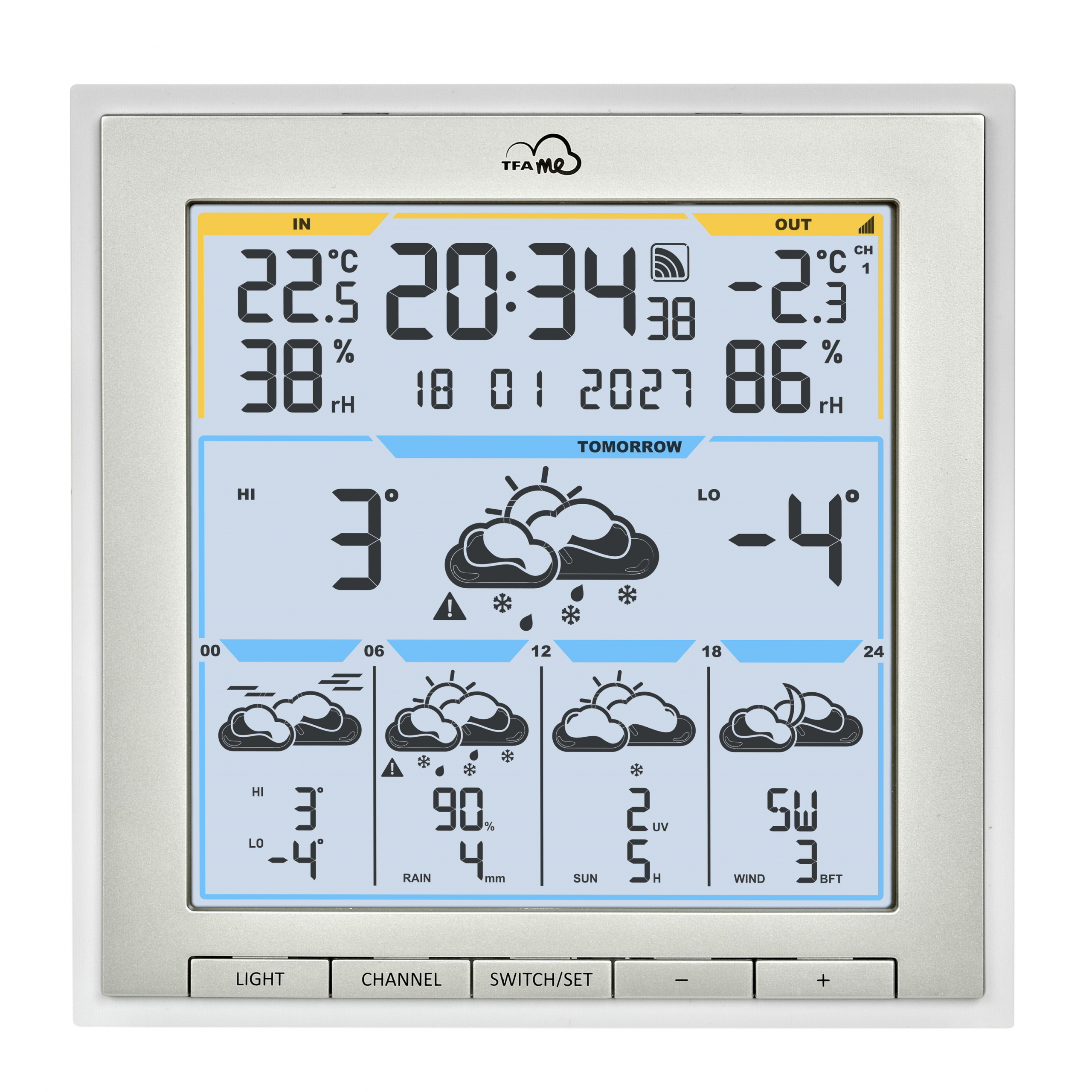 Ez a WLAN vezeték nélküli időjárás-állomás a korábbi, nagy sikerű WETTERdirekt EOS Max továbbfejlesztett változata, amely már az TFA.me okos rendszer részét képezi. A készülék közvetlenül Wi-Fi kapcsolaton keresztül kapja a wetter.com szakemberei által készített, professzionális időjárás-előrejelzést – 5 napra előre, reklámok és előfizetési díjak nélkül. A részletes, nagy kontrasztú kijelzőn mind az előrejelzések, mind a saját helyi mérések áttekinthetően jelennek meg.