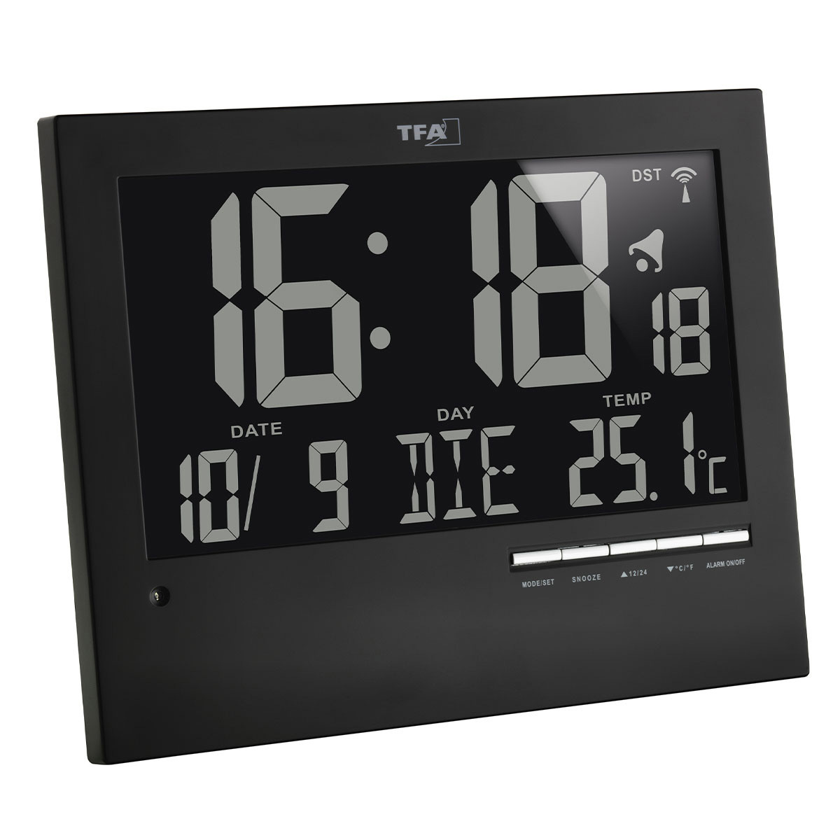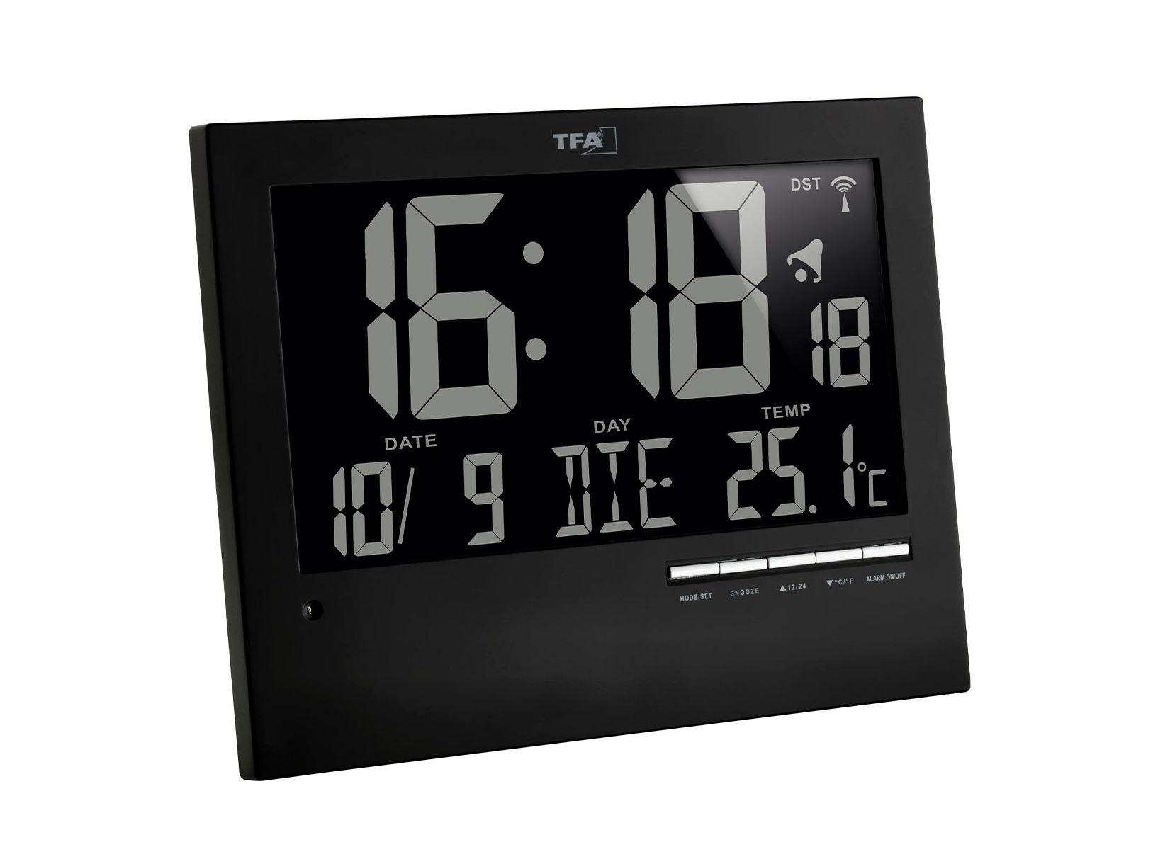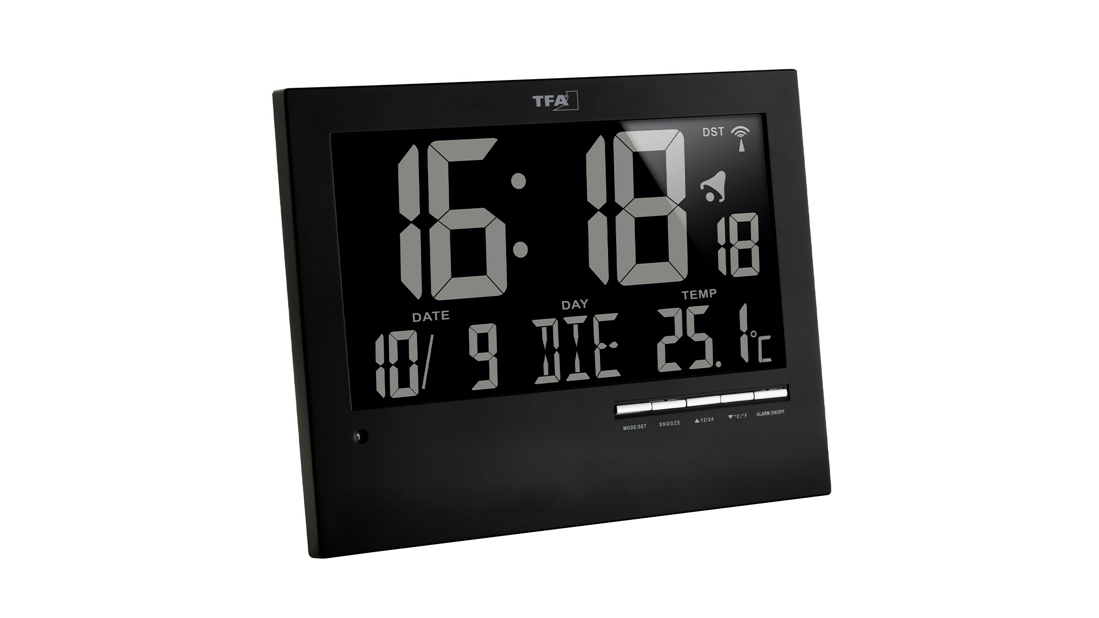 A TFA modern, nagy, fordított kijelzőjű, rádiójellel vezérelt faliórájának különlegessége az automatikus háttérvilágítás nappali/éjszakai üzemmóddal. A beépített fényérzékelő érzékeli, ha a nappali fény már nem elegendő, és szükség esetén diszkrét világítást aktivál. A kijelző sötétben is jól olvasható. Hálózati adapter használata esetén (nem tartozék), a kijelző folyamatosan megvilágítható. Az idő mellett a dátum és a hét napja is megjelenik. A beépített hőmérő méri a belső hőmérsékletet, így kellemes klímát biztosít lakóterében.