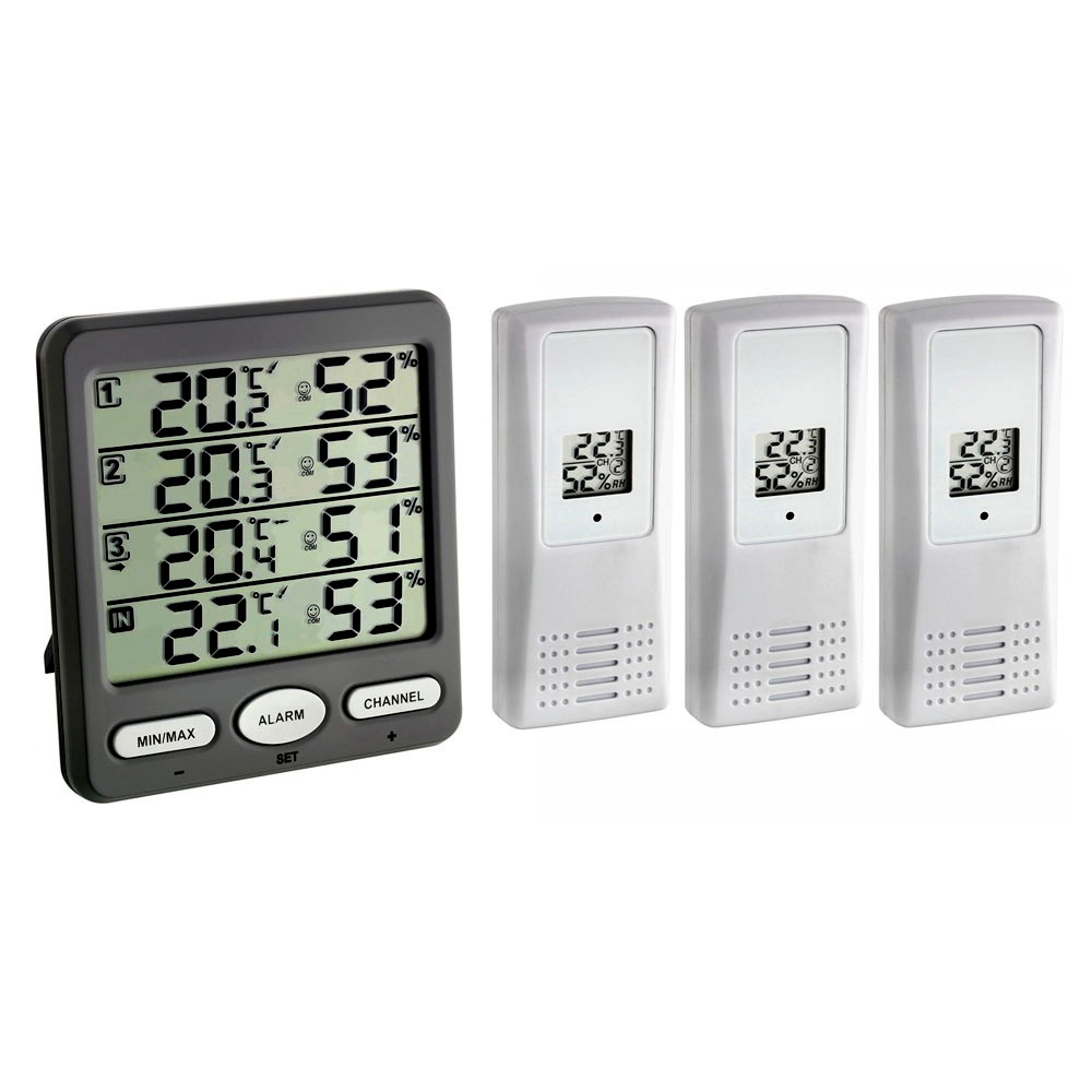 Az ember életének legalább kétharmadát zárt térben tölti. Az, hogy jól érezzük-e magunkat és jól érezzük-e magunkat, nagymértékben függ a beltéri levegő minőségétől. A Klima monitor digitális, vezeték nélküli hőmérő lehetővé teszi a beltéri klíma egyidejű ellenőrzését akár négy helyiségben is. A mellékelt három vezeték nélküli jeladóval a hőmérséklet és a páratartalom más helyiségekben (hálószoba, gyerekszoba, pince, télikert stb...) vagy a szabadban is mérhető. A bázisállomás belső érzékelői a telepítési helyén mérik az értékeket. Minden mérési ponthoz riasztási értékek állíthatók be. A komfortérzetjelzőből megtudhatja, hogy az aktuális értékek a túl száraz, túl párás vagy az ideális szint tartományban vannak-e. A célzott fűtéssel és szellőztetéssel kellemes és egészséges lakókörnyezetet hozhat létre, és még fűtési költséget is megtakaríthat. A Klima monitor összesen 8 vezeték nélküli adóra bővíthető.