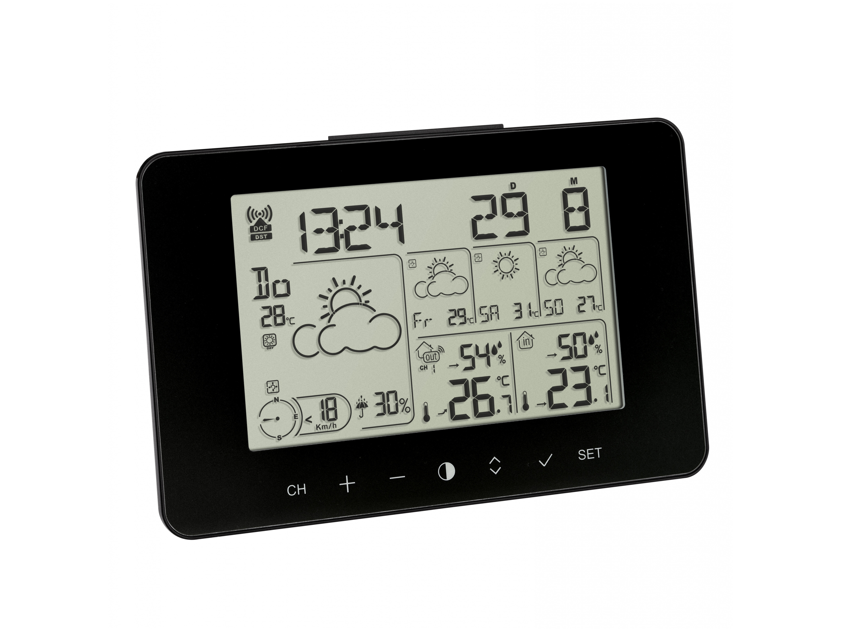 - Emellett más hasznos időjárási adatokat is kap, például az eső valószínűségét, a szélerősséget és a szélirányt. Így mindig gyors és részletes áttekintést kaphat a következő napok időjárásáról. Ezenkívül az állomás figyelmeztet az olyan kritikus időjárási körülményekre, mint a fagyos nedvesség, a havazás és a köd. Az utasítások hét nyelven szöveges formában jelennek meg a kijelzőn.