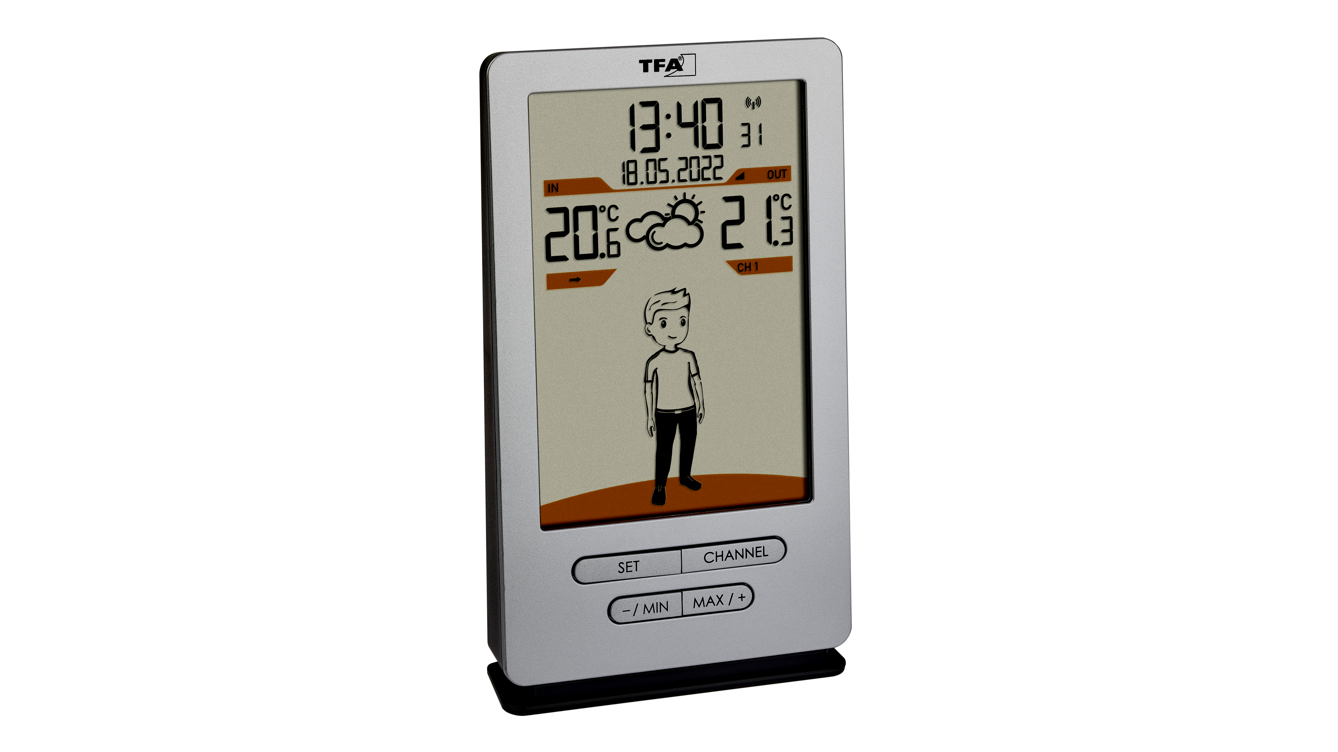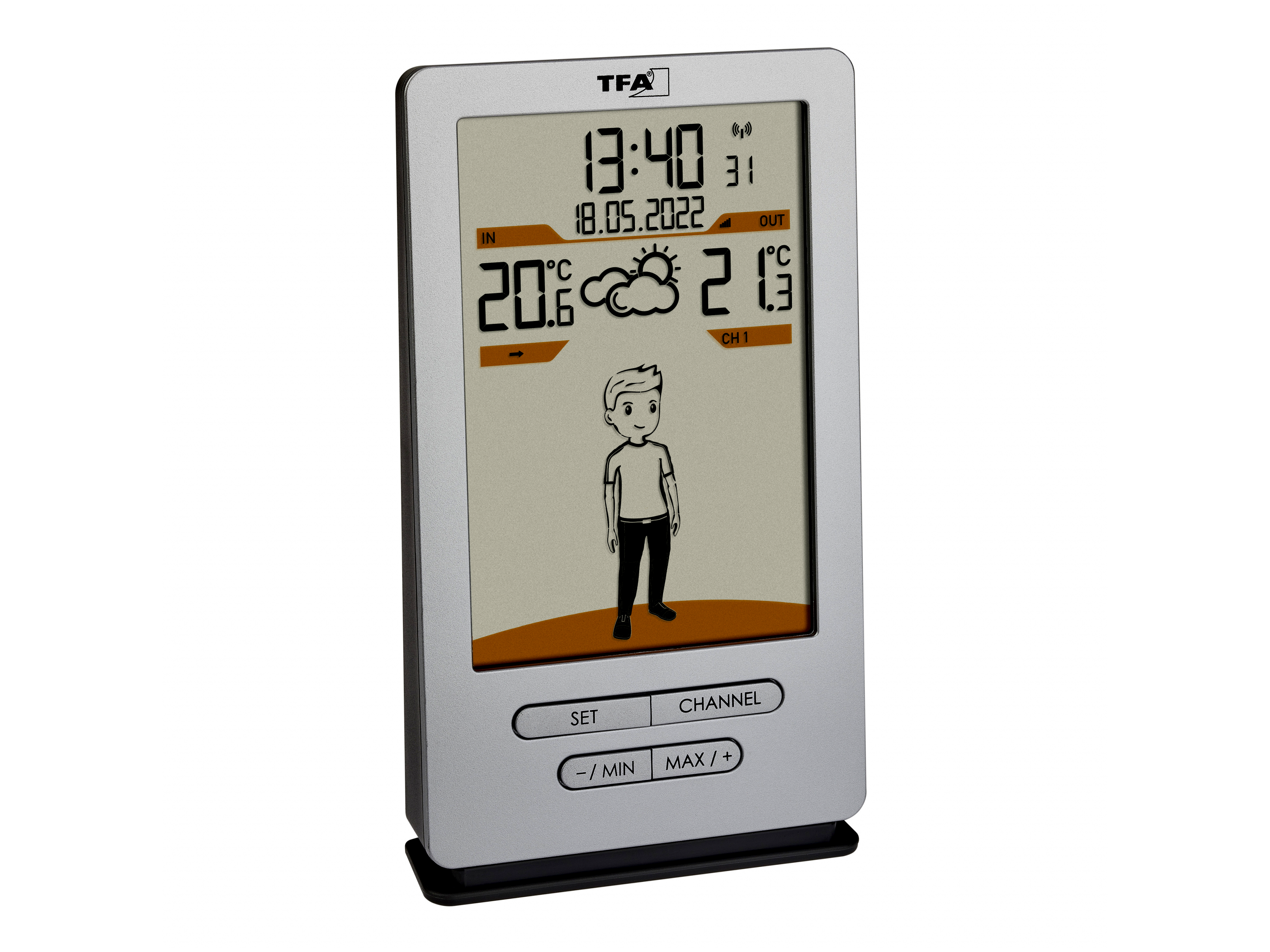 - A vezeték nélküli kültéri jeladó hatótávolsága 100 méter. Kültéren kerül felállításra, és ott méri a hőmérsékletet. Egy beépített érzékelő méri a helyiség hőmérsékletét azon a helyen, ahol az állomást felállították. Szeretné szemmel tartani a hőmérsékletet más helyiségekben is? Két további, külön megvásárolható hőmérséklet-jeladó csatlakoztatható. Így gyorsan eldöntheti, hogy például a gyerekszobát szellőztetni, vagy az irodát fűteni kell-e.