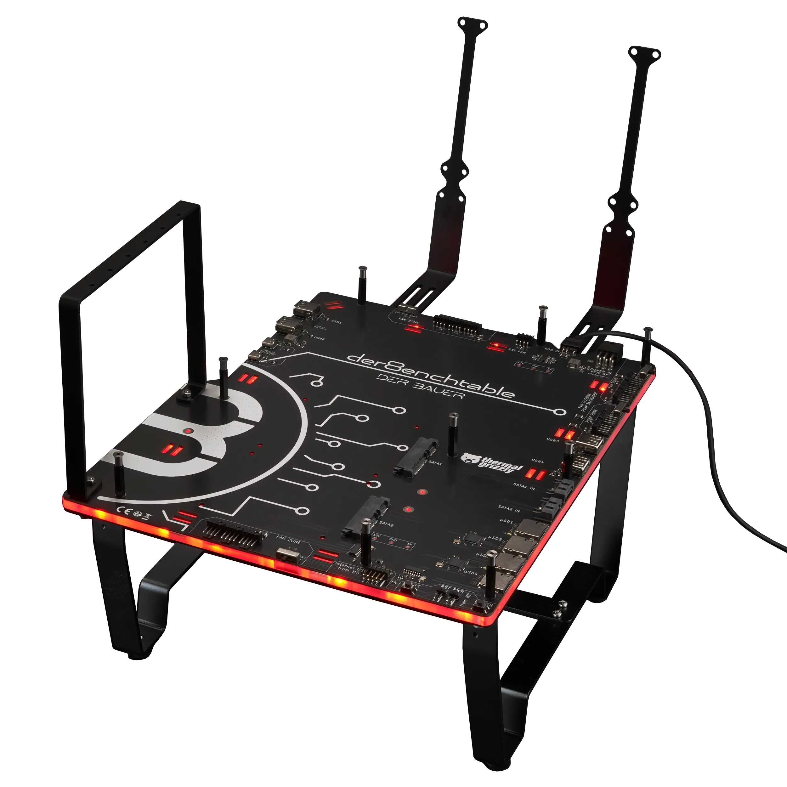 A beépített címezhető RGB (aRGB) világítás 3 tűs csatlakozón keresztül kapcsolódik az alaplaphoz (GND / – / D / 5V), vagy külön aRGB vezérlőhöz. Így a tesztállomás nemcsak funkcionális, hanem látványos része is lehet egy stúdiónak vagy laboratóriumnak, akár videós tartalomkészítéshez, akár ügyfélprezentációkhoz.