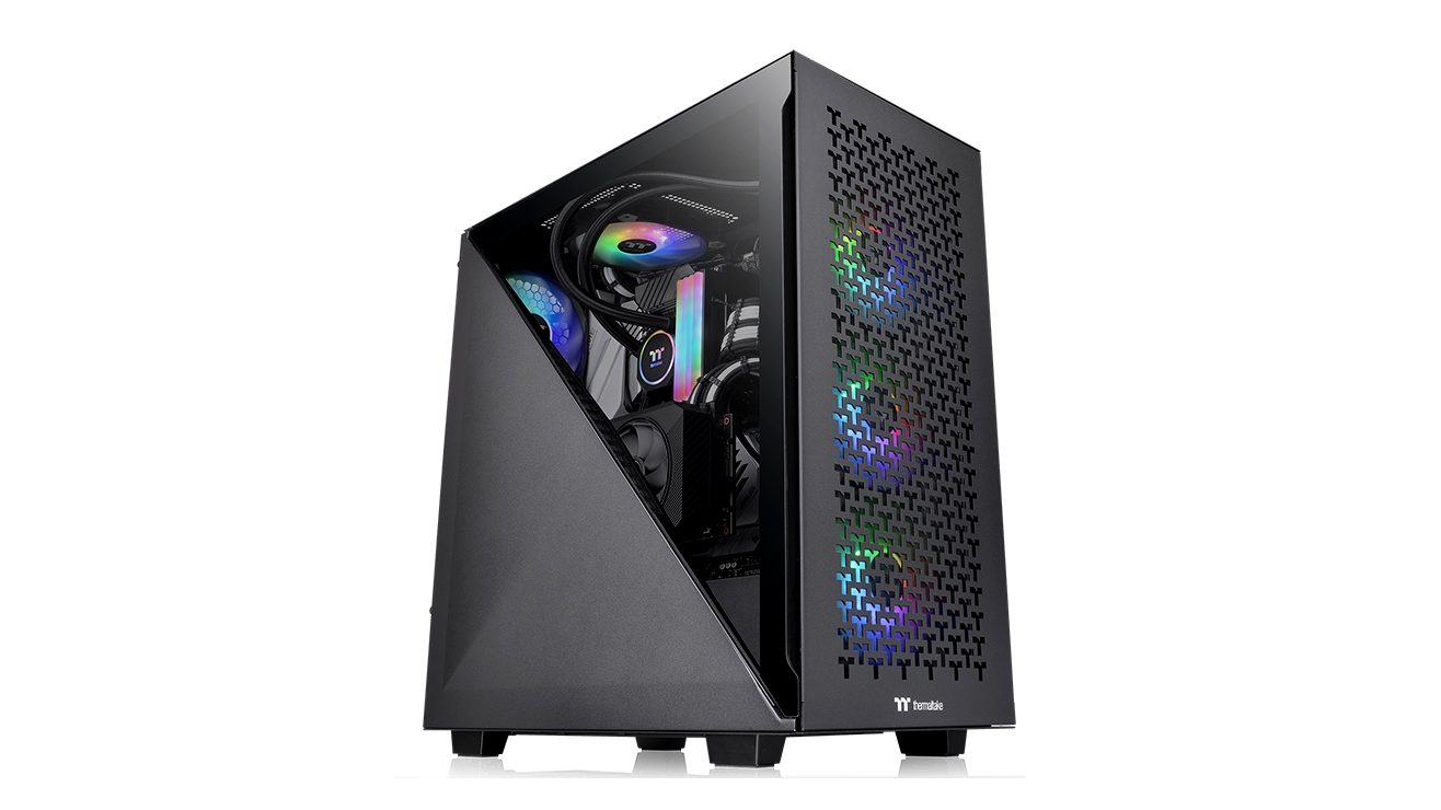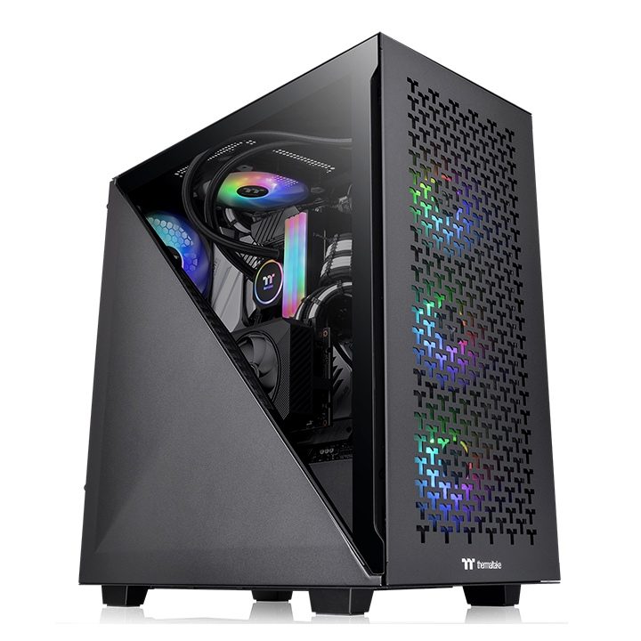 A Divider 300 TG Air ATX középső toronyház, két előre telepített 120 mm-es szabványos ventilátorral, elöl teljes méretű hálós panellel és egy 3 mm-es háromszög alakú edzett üvegablakkal a bal oldalon.