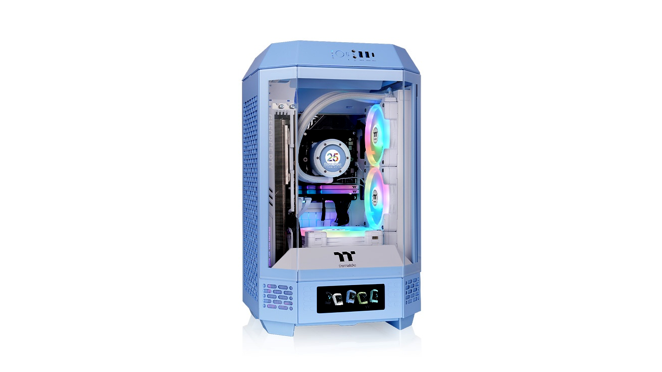A Thermaltake The Tower 250 Hydrangea Blue a legújabb mini-ITX számítógépház, amely klasszikus vertikális kialakítással és nyolcszög prizma formával rendelkezik. A kompakt méret ellenére a hűtési teljesítményt nem áldozza fel: két CT120 ventilátort tartalmaz, és akár nyolc 120 mm-es ventilátort, valamint egy 360 mm-es AIO radiátort is támogat a jobb oldalon. Az egyedi megjelenés érdekében a külön is megvásárolható 3.9" LCD Kijelző Készlet és Házaállvány Készlet is hozzátehető.