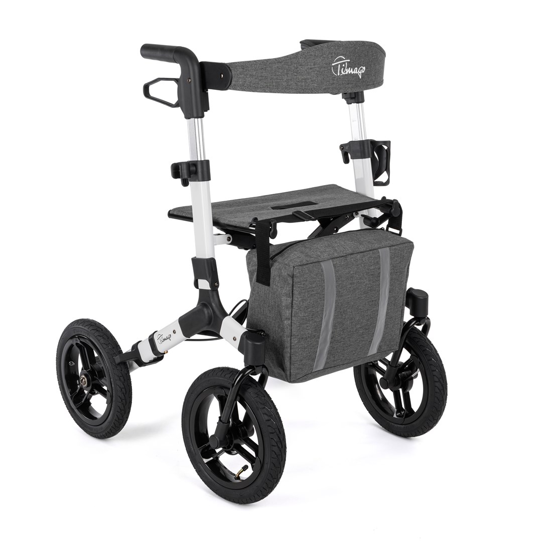 A rollátor a következő elemekkel érkezik: keret beépített üléssel, első kerekek, hátsó kerekekkel ellátott lábak, háttámasz, bevásárlótáska, pumpa, pohártartó, mankó/bottartó.