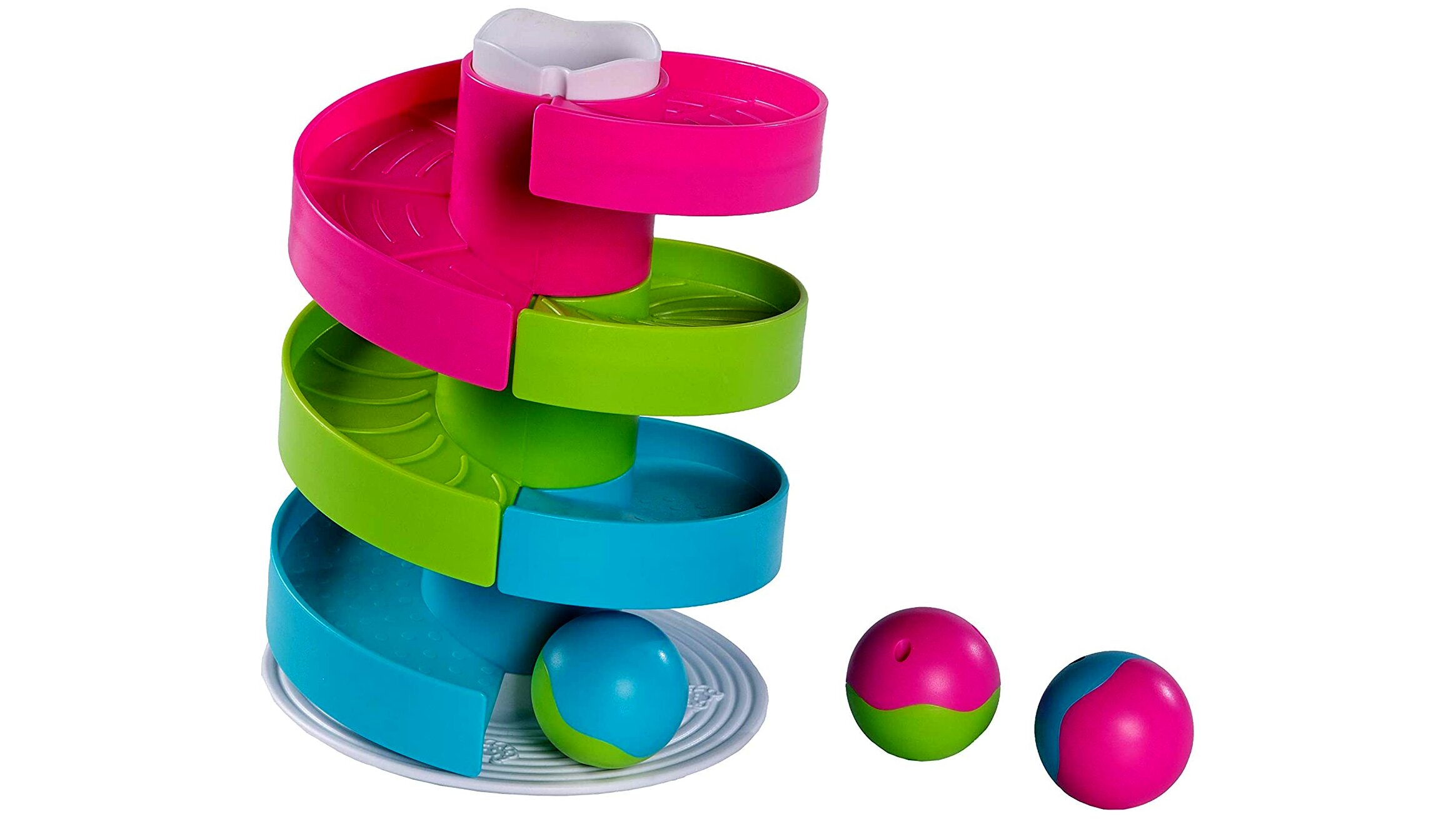 A Fat Brain Toys Spiráltorony bébijáték minden kisgyermek figyelmét leköti és remek szórakozási lehetőséget biztosít. Ebben a játékban a három, különböző textúrájú pályaelemen csörgő labdák gurulnak végig, amelyek tetszőleges sorrendben illeszthetők össze, így mindig új variációkat próbálhatnak ki a kicsik.