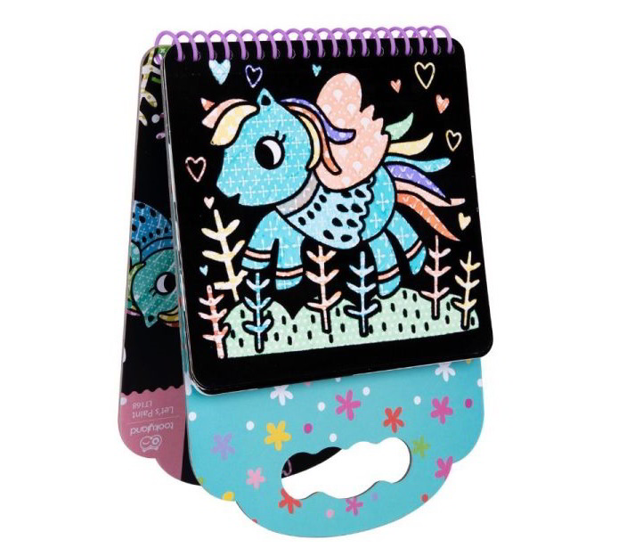 A kis művészek a szett segítségével kibontakoztathatják tehetségüket és csodálatos képeket alkothatnak. A képeken egyes helyeken fekete bársonybevonat található, a fehéren hagyott részeket viszont kiszínezhetik a gyerekek a csomagban található filctollak segítségével. A bársony felületnek köszönhetően könnyebb a vonalon belül maradni. A