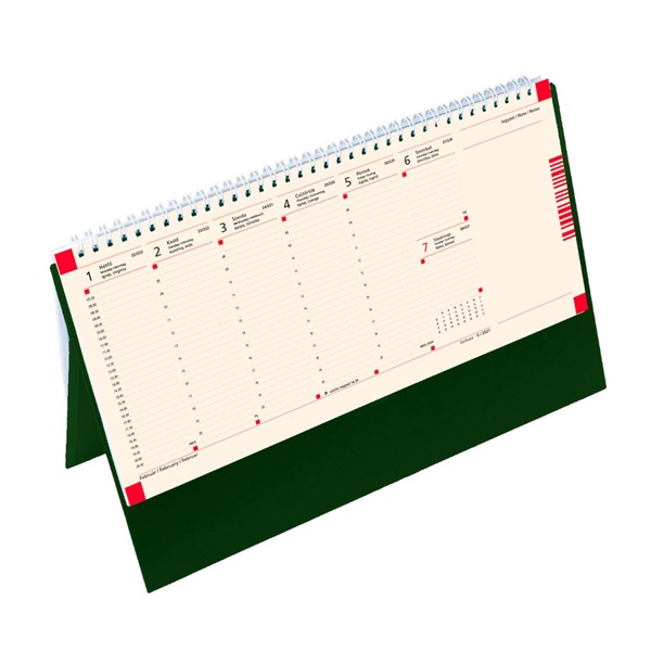 Műbőr táblával készült, chamois (krémszínű) tömbös, álló asztali naptár, vágott jegyzettömbbel.