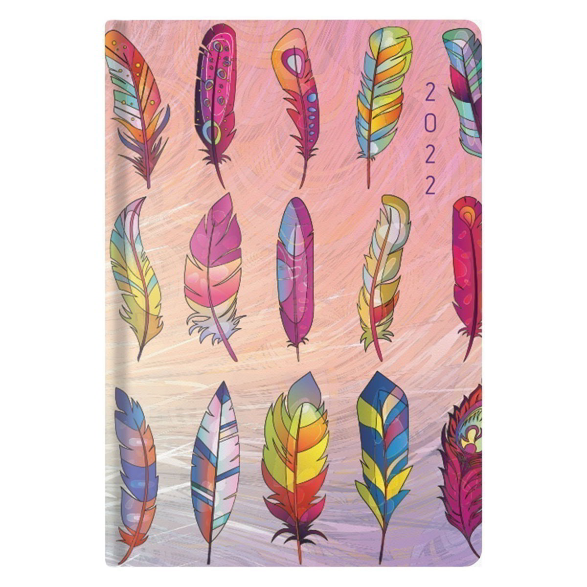 Többféle grafikával díszített, puha fedeles, fényes fóliával bevont, fehér tömbös heti naptár sarokperforációval.