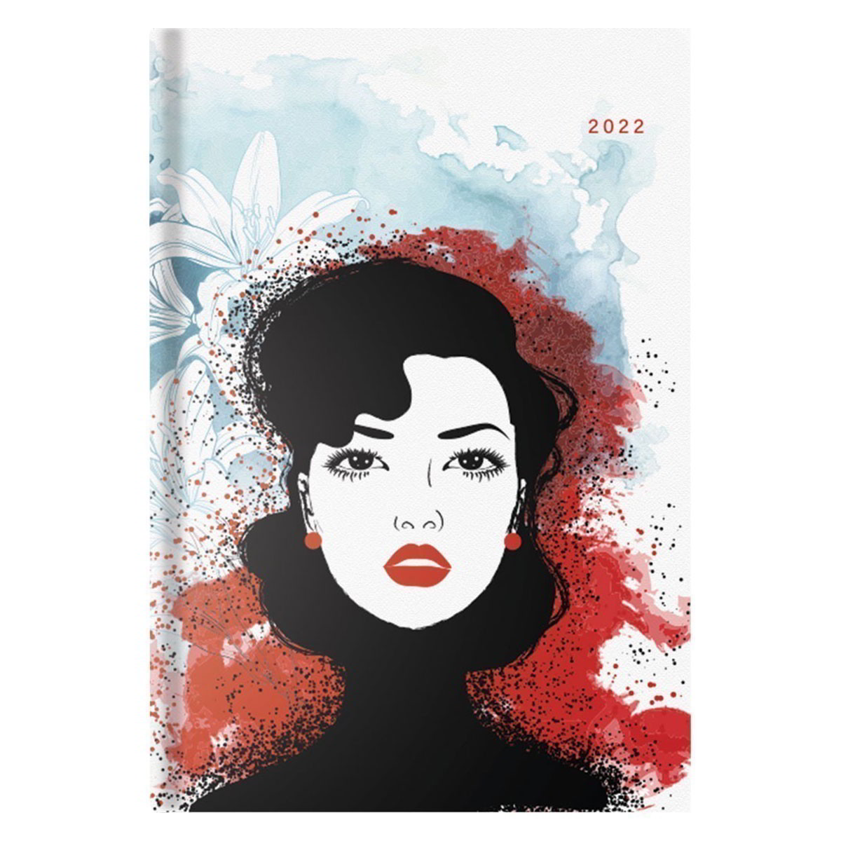 Többféle grafikával díszített, puha fedeles, fényes fóliával bevont, fehér tömbös heti naptár sarokperforációval.