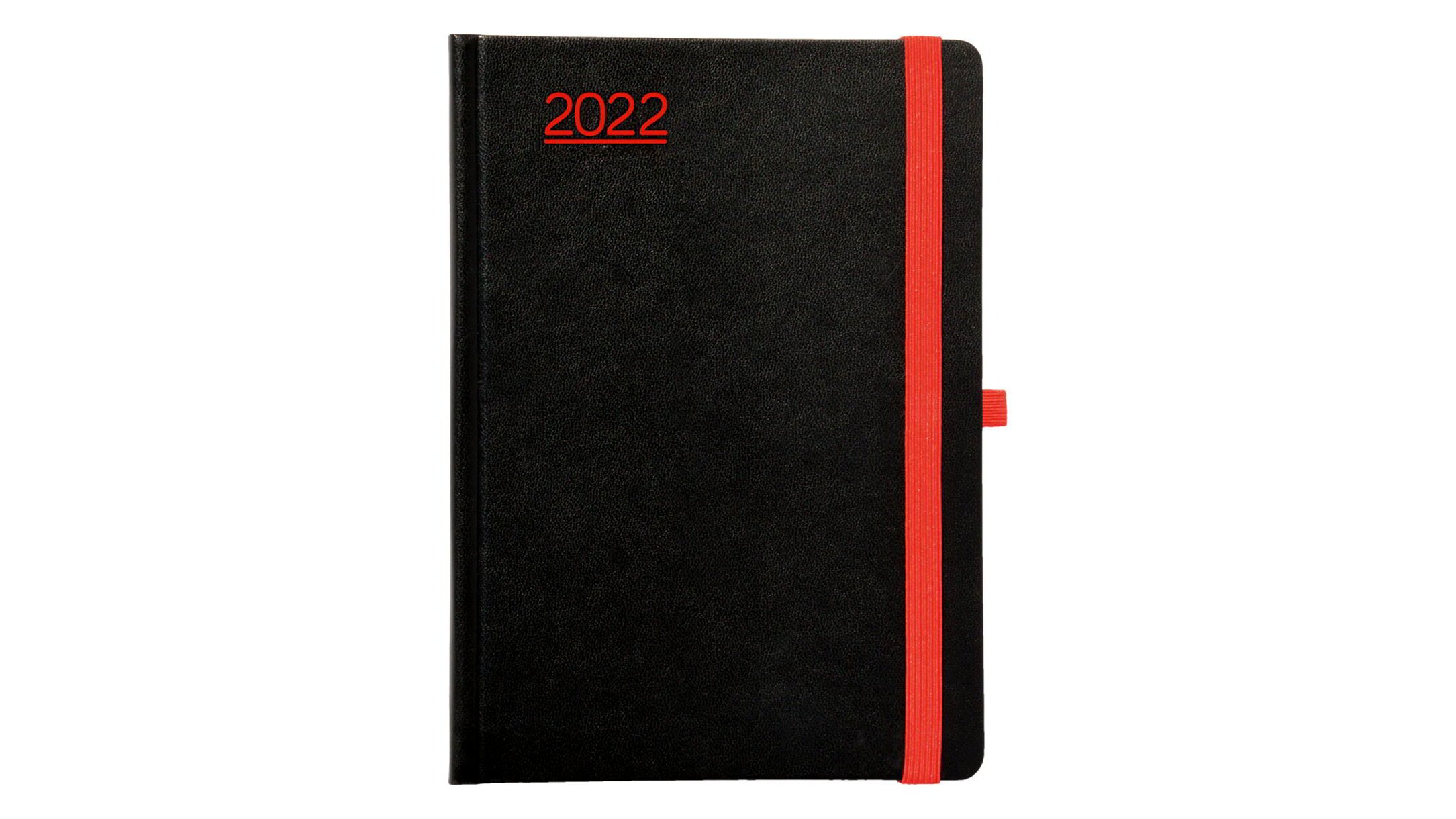 Fényes műbőr bevonóval, az átfogó gumiszalag színével megegyező évszámmal, tolltartóval, és sarokgömbölyítéssel készített, fehér tömbös napi naptár, a gumiszalag színével harmonizáló oromszegővel, jelzőszalaggal és sarokperforációval.