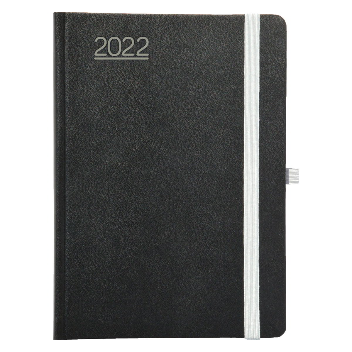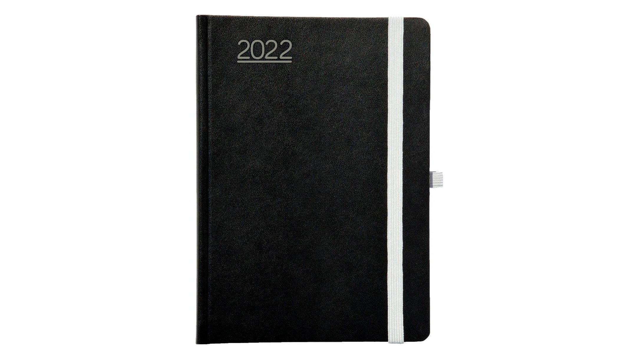 Fényes műbőr bevonóval, az átfogó gumiszalag színével megegyező évszámmal, tolltartóval, és sarokgömbölyítéssel készített, fehér tömbös napi naptár, a gumiszalag színével harmonizáló oromszegővel, jelzőszalaggal és sarokperforációval.
