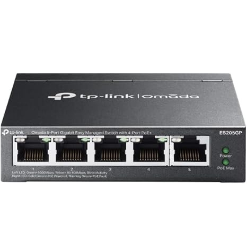 Portok: 5× RJ45 LAN (10/100/1000 Mbps), ebből 4× PoE képes