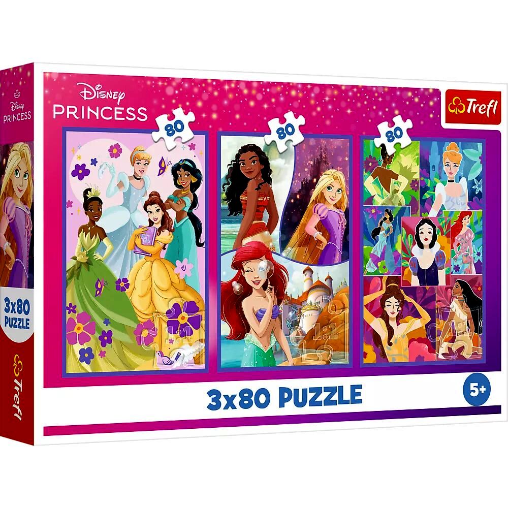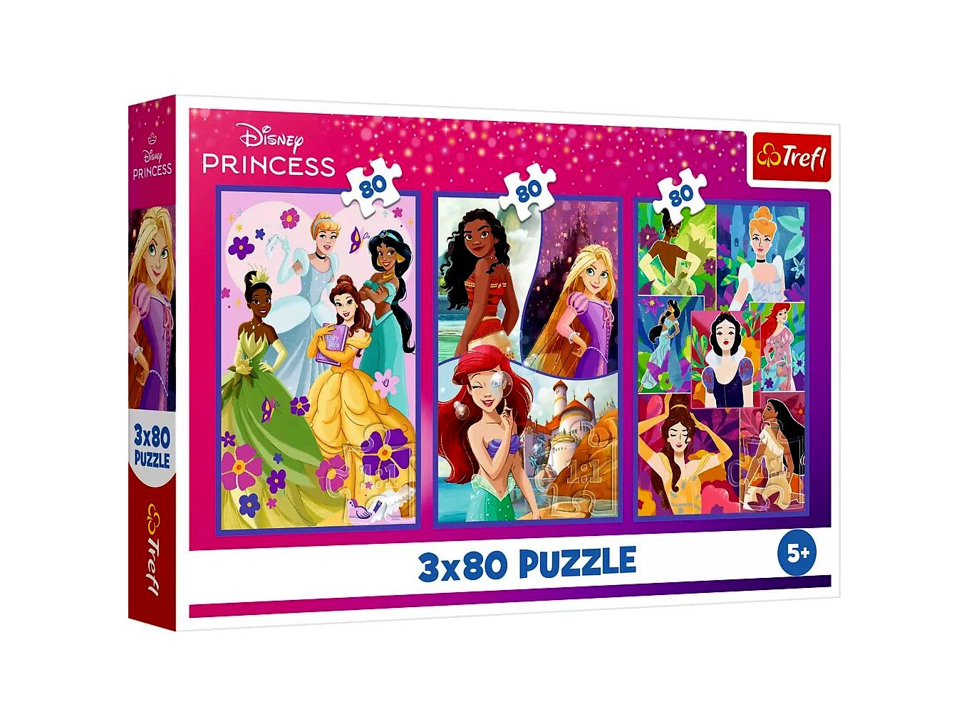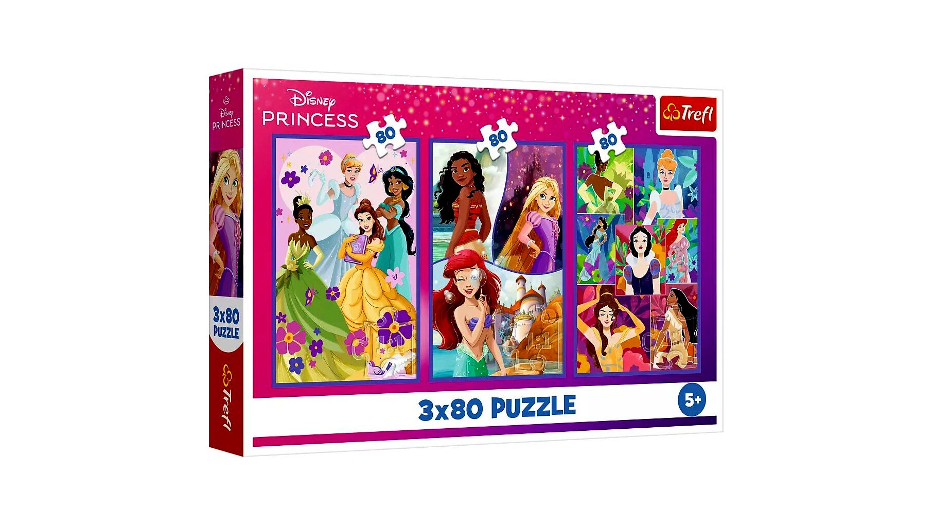 Fedezd fel a Disney hercegnők világát a Trefl 3 x 80 darabos puzzle készlettel! A nagy népszerűségnek örvendő hercegnők barátnői mesés kalandokat rejtenek el minden egyes kirakóban, amelyek garantáltan lekötik és szórakoztatják a kicsiket és a nagyokat egyaránt.
