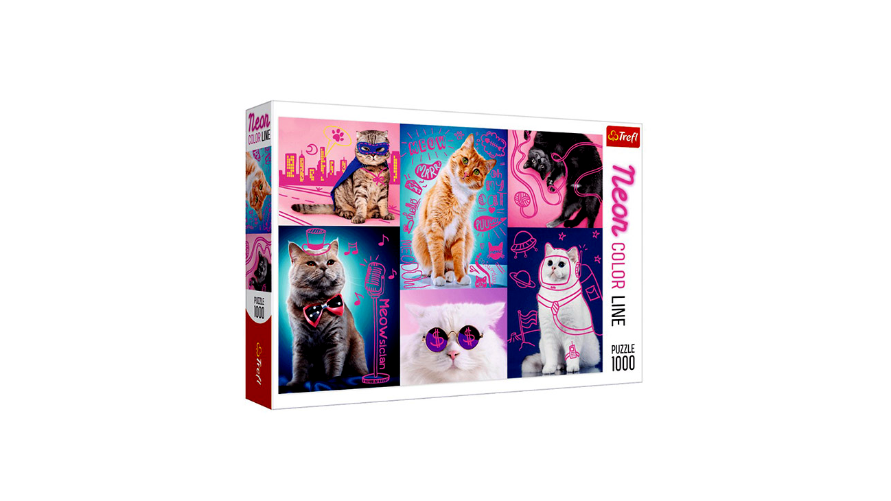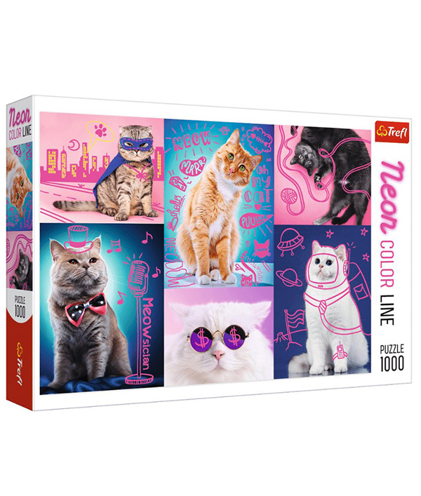 A gyerekek macskák képét rakhatják ki az 1000 db-os világító, neon színekkel díszített kirakó segítségével. A kirakós játék nagyszerűen fejleszti a kézügyességet, növeli a finommotorikát, a megfigyelőképességet és tökéletesen kitölti a szabadidőt. A gyermek puzzle jó választás minden korcsoportba tartozó gyermek számára. Minden egyes kirakott puzzle szétszedhető és ismét összerakható, de az elkészült motívum alá ragasztót helyezve örökös és egyben emlékezetes dekorációt készíthetünk a gyerekszobába. Kép mérete: 68 x 48 cm.